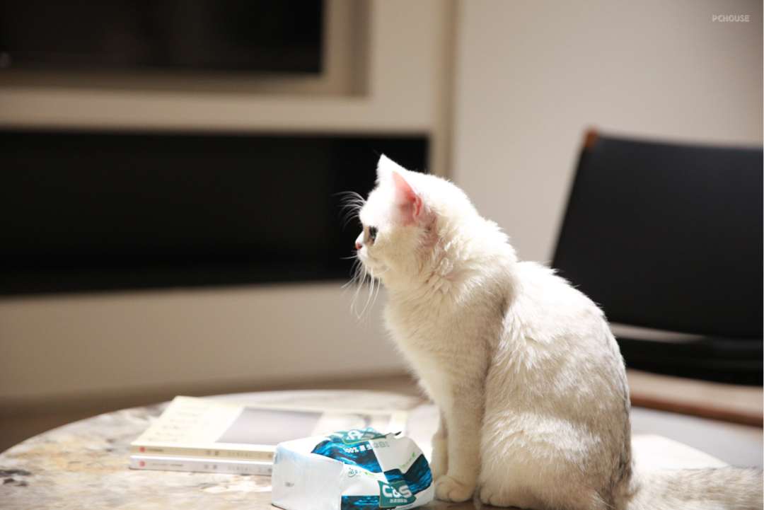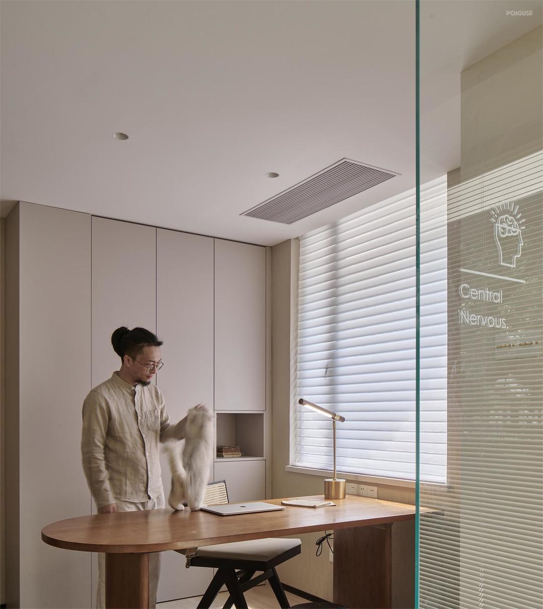 右侧同样用玻璃作为隔墙,将洽谈室设计成小型客厅,旁边还可以看到猫屋的一部分。