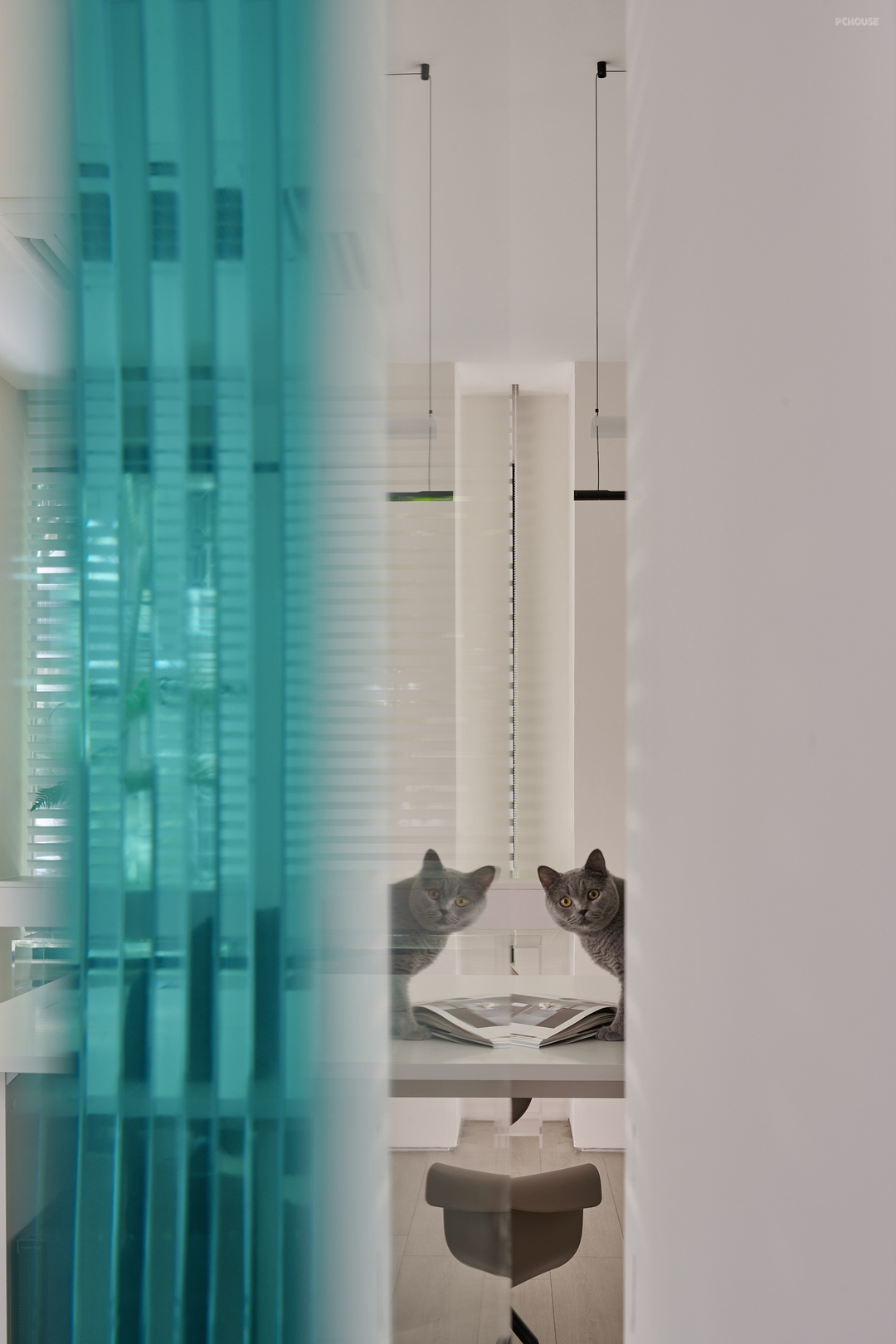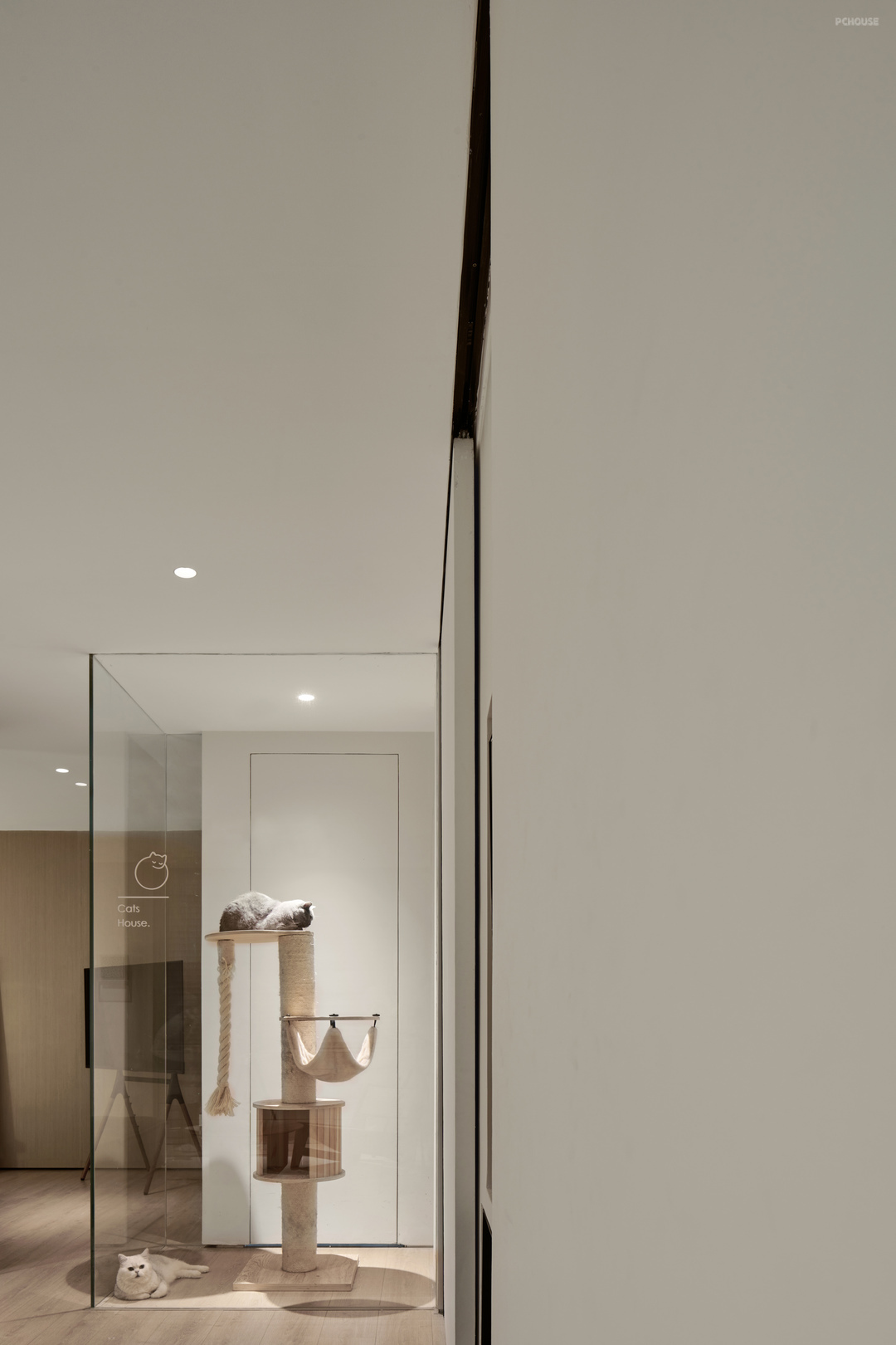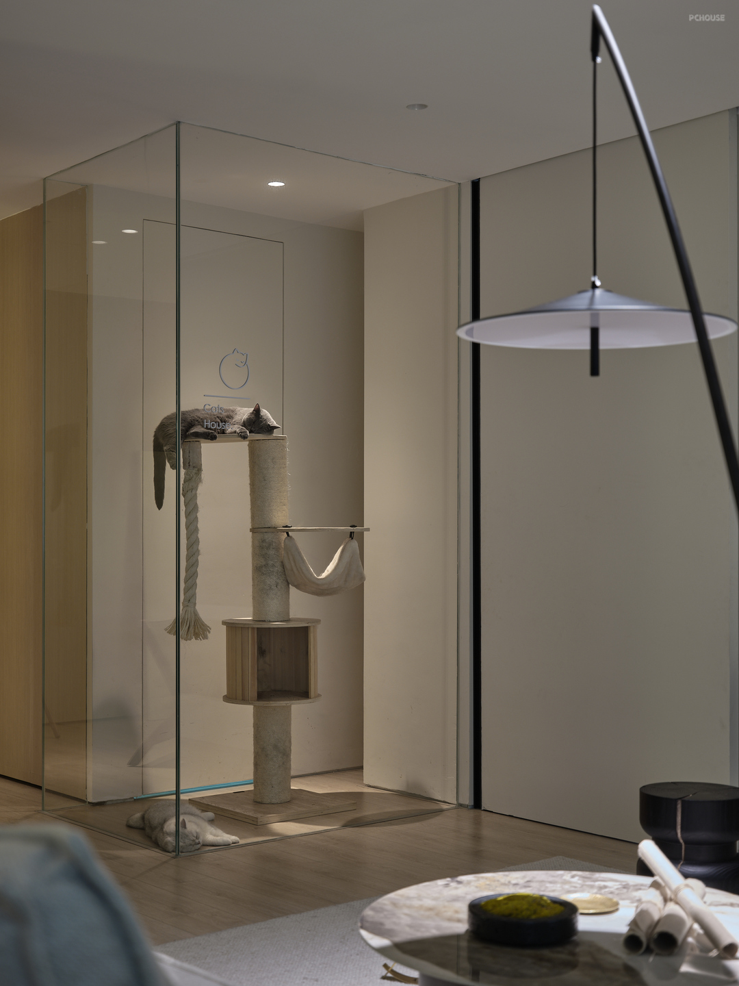 用玻璃作为隔墙,增加视觉效果和空间感,还可以看到猫屋的一部分。