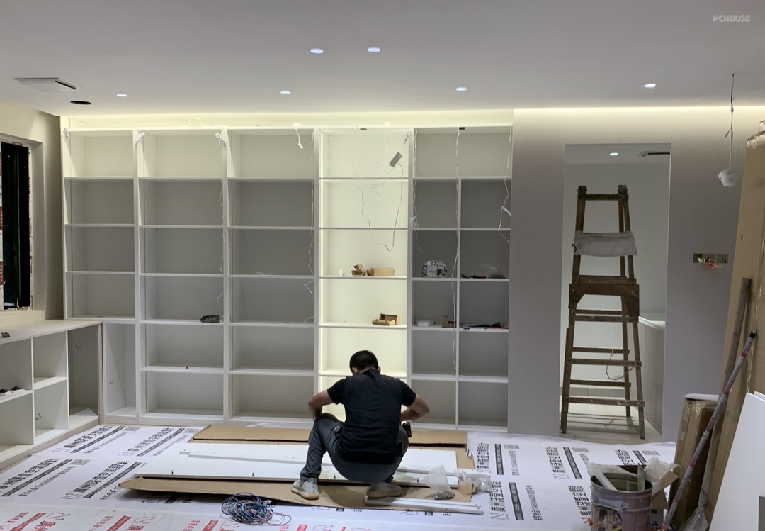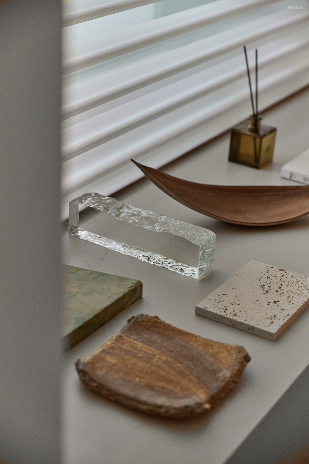 承重墙的位置加装了展示柜,除了放艺术摆件外也可用作书架。
