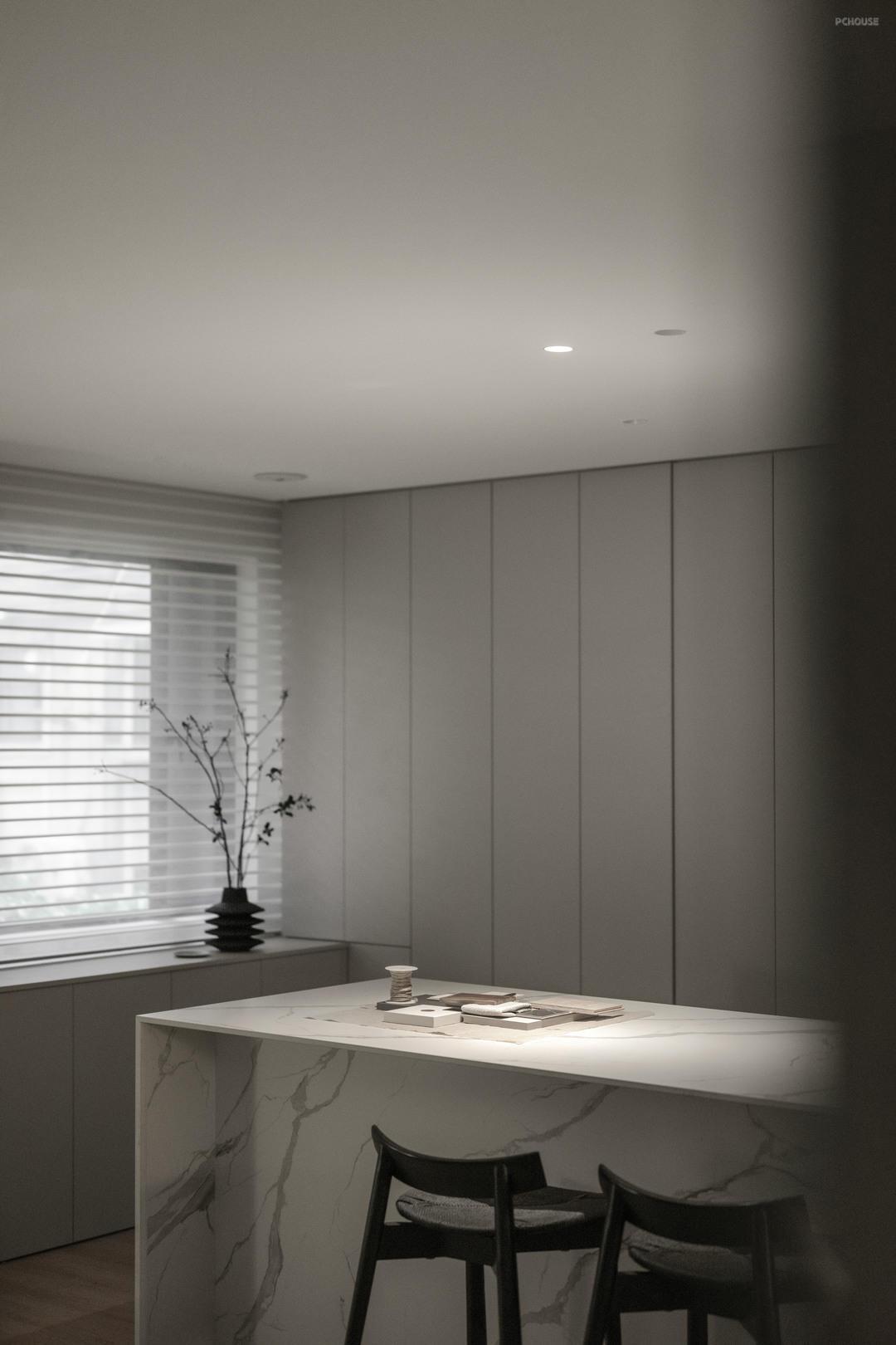 沙发后面摆放岩板吧台,底下设计按压式抽屉,日常也可作为选材操作台。