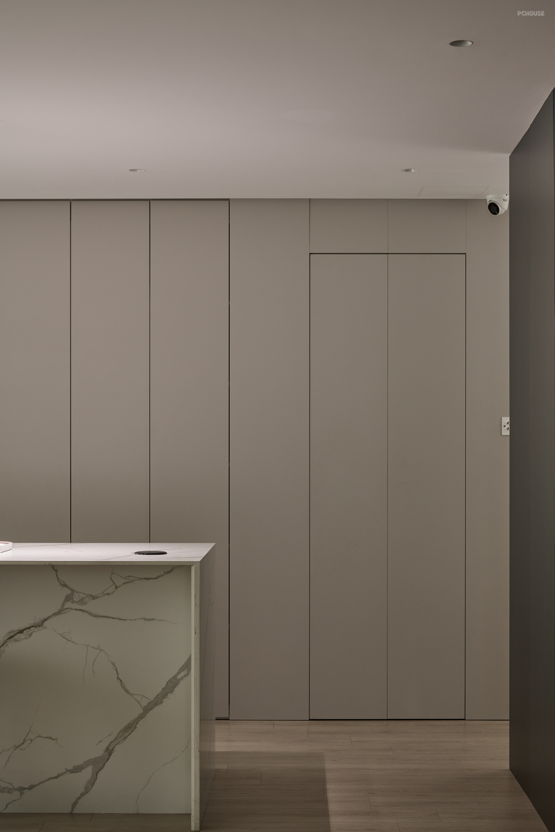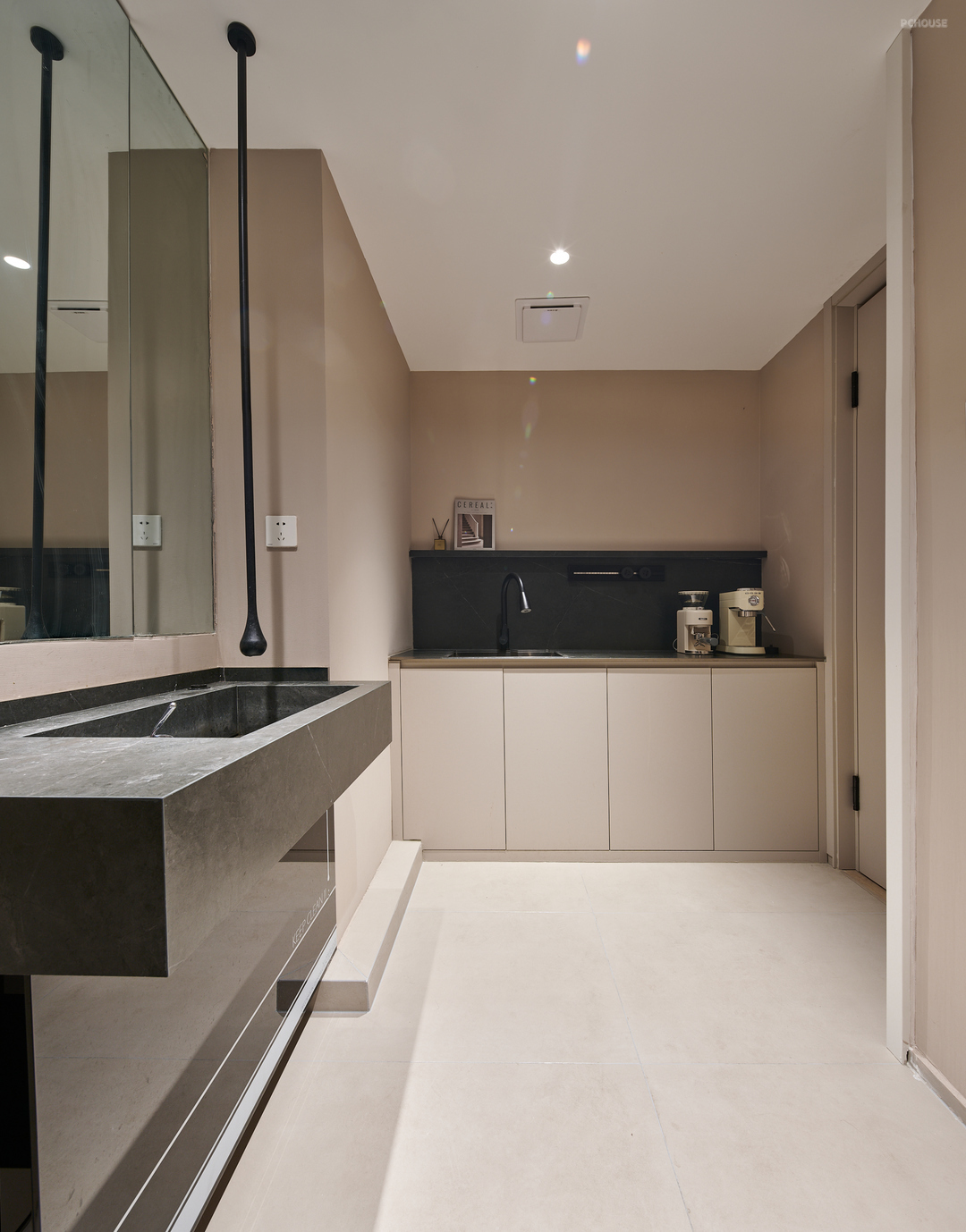 接待区沙发后面的岩板吧台,底下设计按压式抽屉,增强收纳。