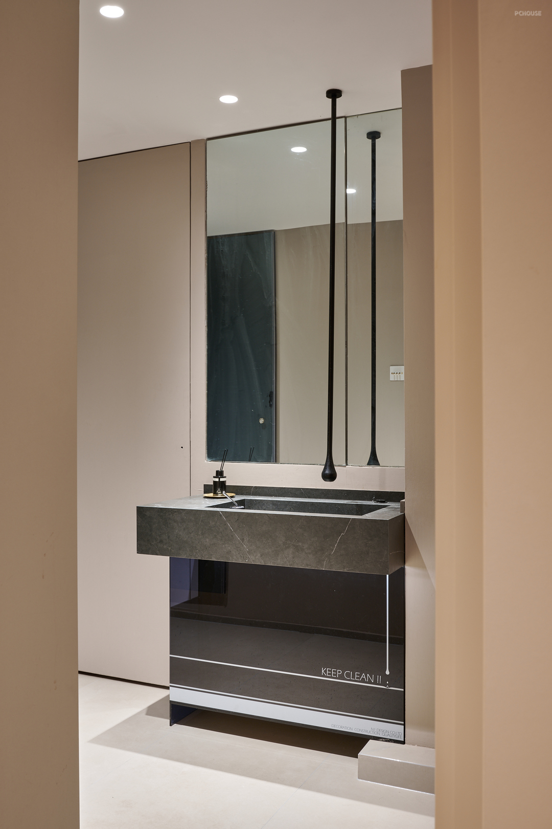 在定制岩板洗手台上方安装吊装式水龙头,不仅节省台面的空间,而且颜值超高有设计感。