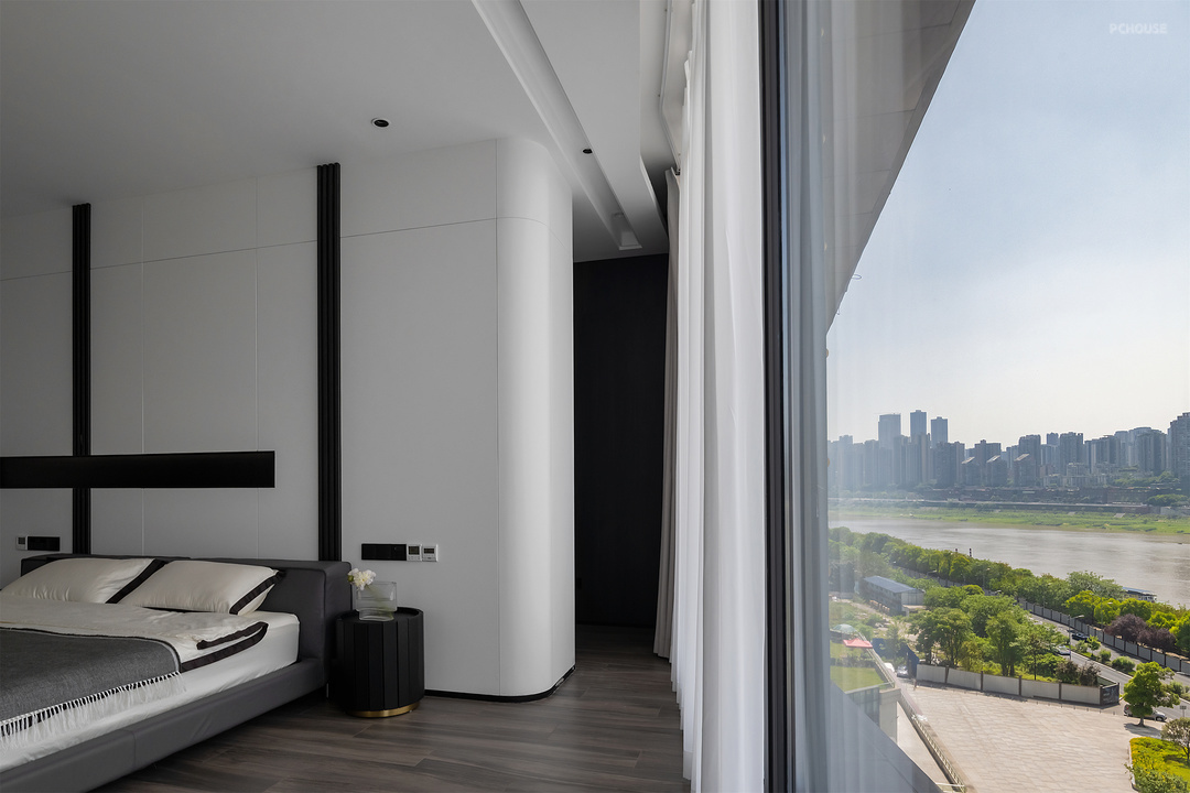 设计师将主卧设计成超大的江景套房,每个空间独立又贯通。大面积采用天然材料,将意式极简风格变得更纯粹,大面积玻璃幕墙,远眺长江,微风吹拂着窗纱,设计在灵动的韵律感和个性审美的独特中获得了平衡。