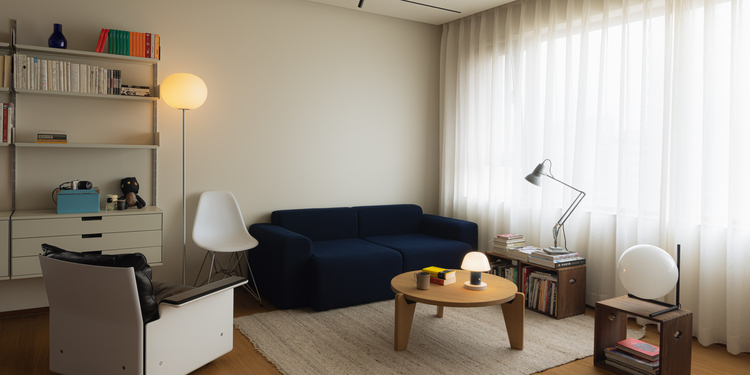 没有传统的背景墙或电视柜,加装地拉式投影仪,空间更加干净整洁