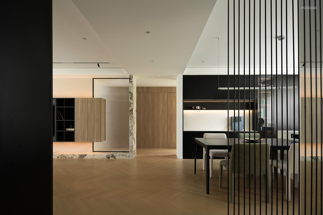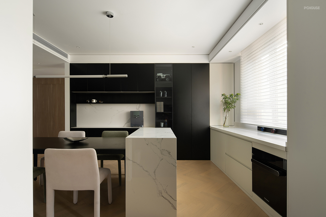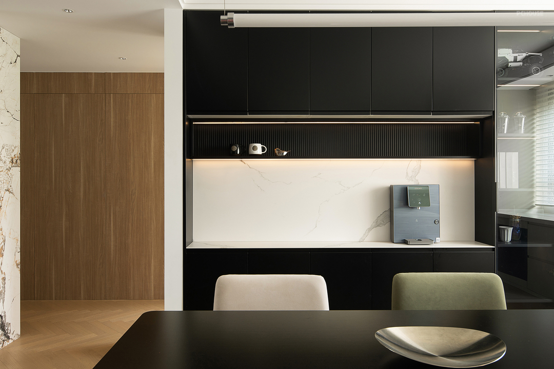 餐桌后方做定制柜,中间留白作为水吧台使用,不堆砌复杂与华丽表象,空间按需分隔排布,给予舒适的尺度和恰到好处的美感。