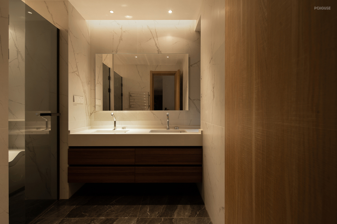 好的设计应该是合适的,是适度的设计。原次卫改造为开放式中厨后,这里成为家中卫浴的集中空间,为保障日常使用效率,做三分离+双台盆设计,功能区相互独立,不影响各自工作,同时以透黑玻璃门做区域分割,保障空间整体的通透感。