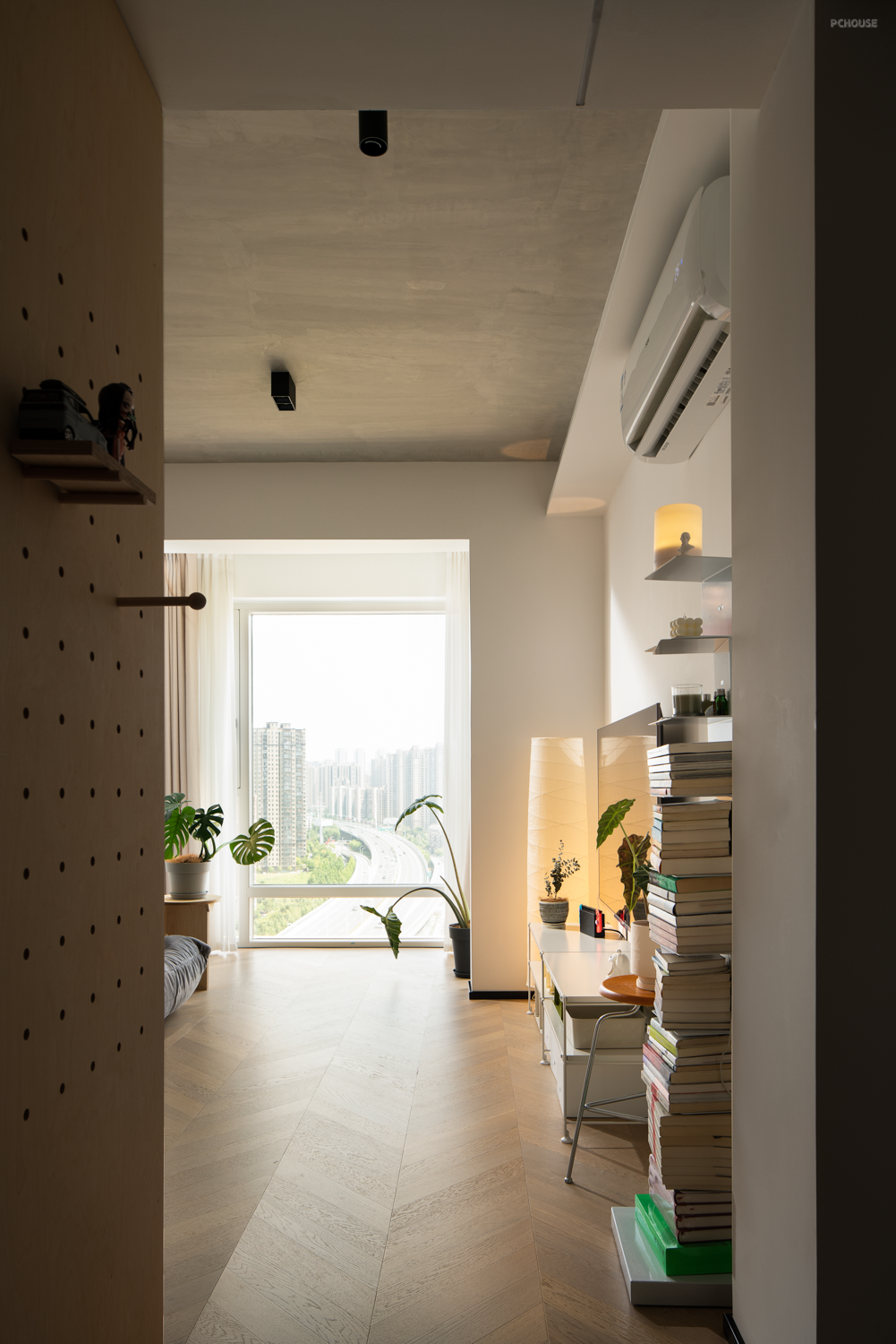 由于偶尔需要加班,所以将书房布置在最靠近窗台的角落。所有的物品放置的位置都恰到好处,不浪费一丝空间线索,把空间利用到极致又留有互动的小小的窗口,每个区域之间有open-house的意义。
