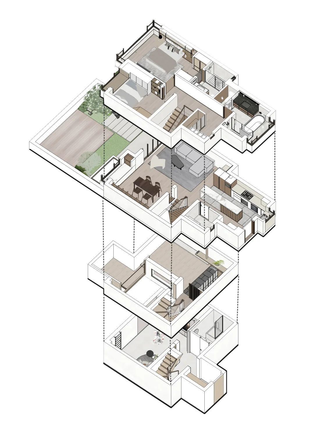 地下室的房屋原有格局存在一定空间利用率的缺陷,在此前提下,我们将欠缺转化为亮点,把天井容纳至地下区,让每一个角落都能恰如其分的为屋主及家人、宠物的生活而服务——地下空间拥有三个独立区域,形同3个方盒子堆叠而成。