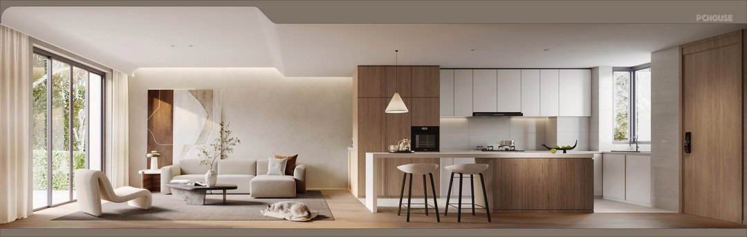 一层为无隔断的大平面公区。入口处,将开放式厨房与收纳木作柜体并置,共享有限空间,将收纳规范在浅木色系的柜体中,让空间视觉达到素净、清爽的效果;同时,兼具生活实用性,顾及母亲使用时的便捷度,及宠物活动区域的开阔性。