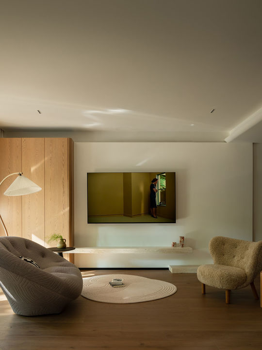 地下一层为榻榻米房,可独处冥思、也供会客,地下二层有2个独立空间:家庭娱乐室为挑高空间,而阅读区则形同树屋,悬空于地下一层的半层高处。