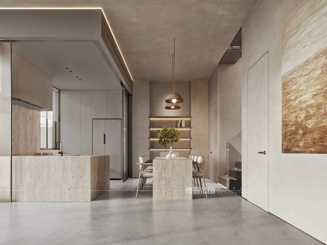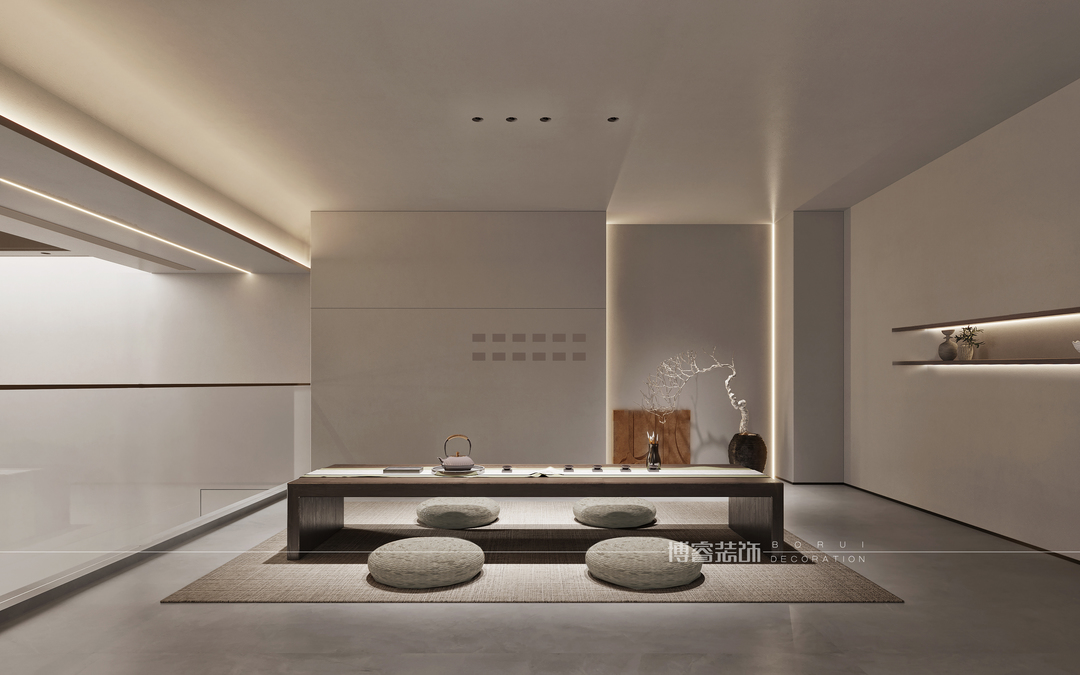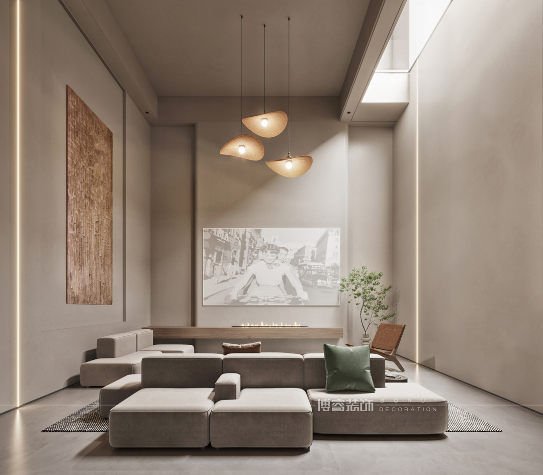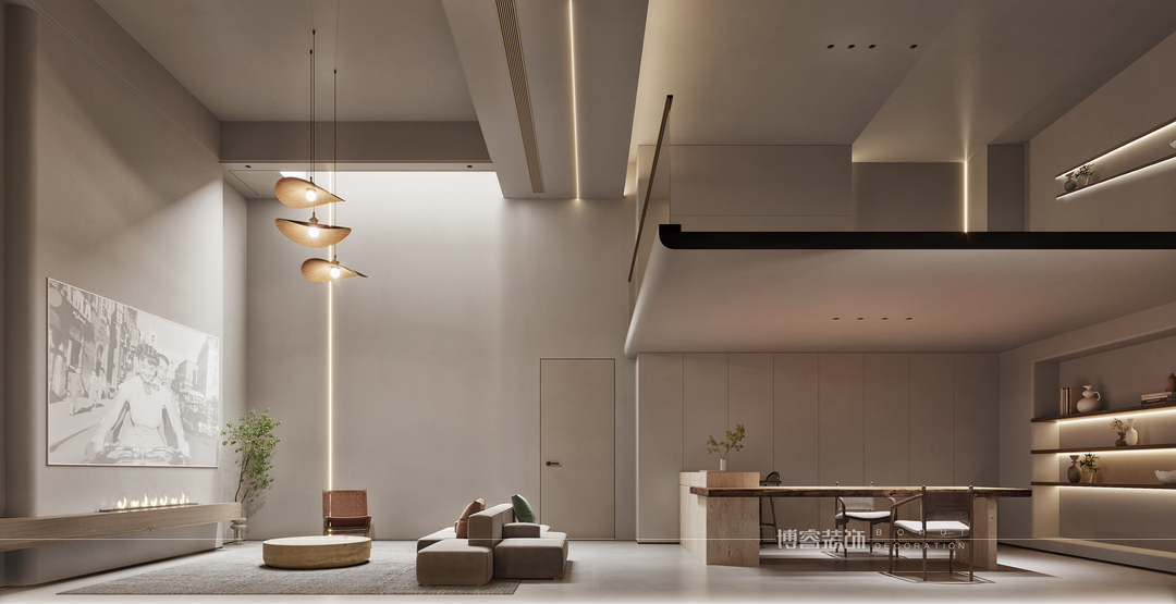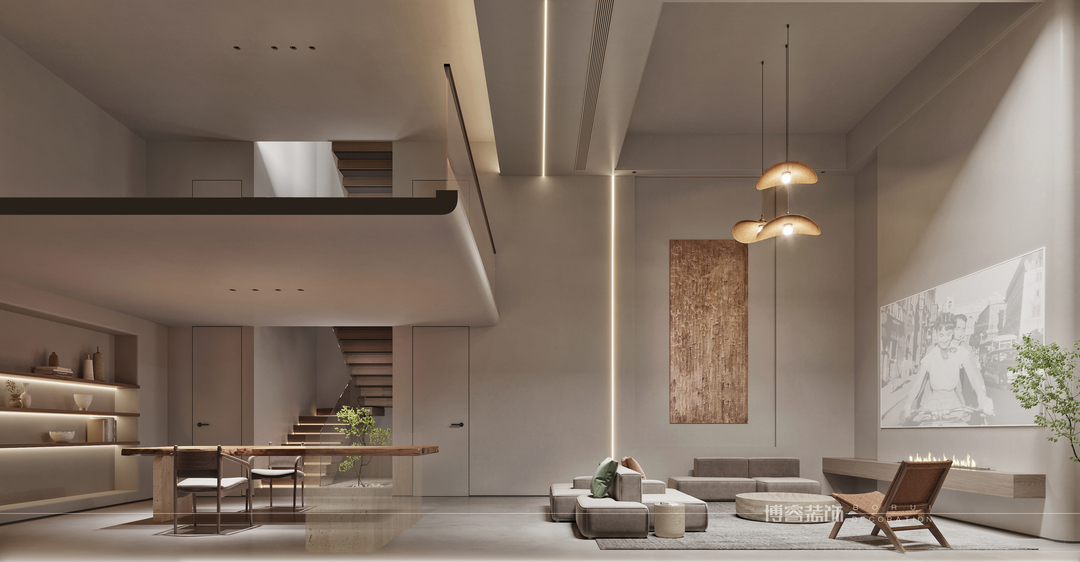 负二客厅的挑空,延伸至办公/吧台区,再由楼梯过渡到茶室,以敞开的空间形式跟生活动线方式形成区域的“软隔断”,赋予空间自由的流通感。