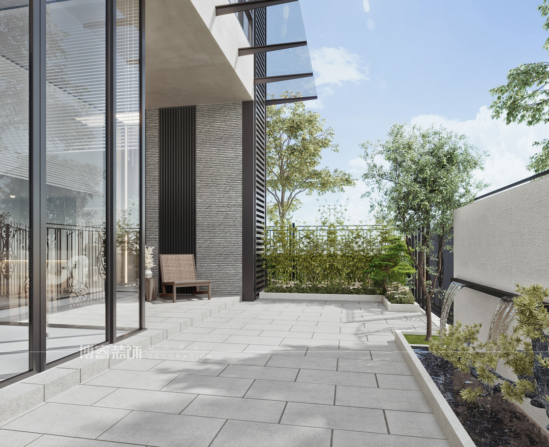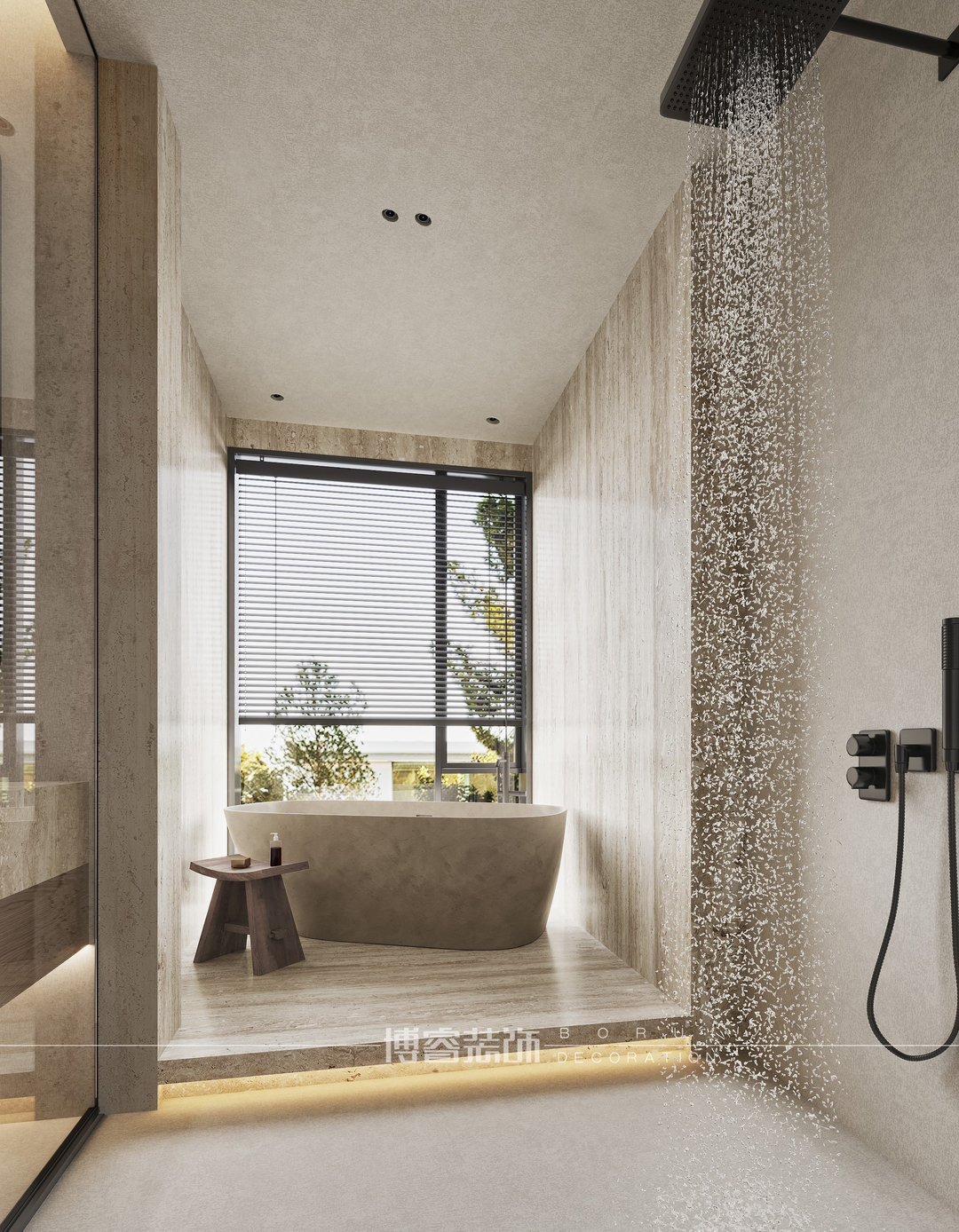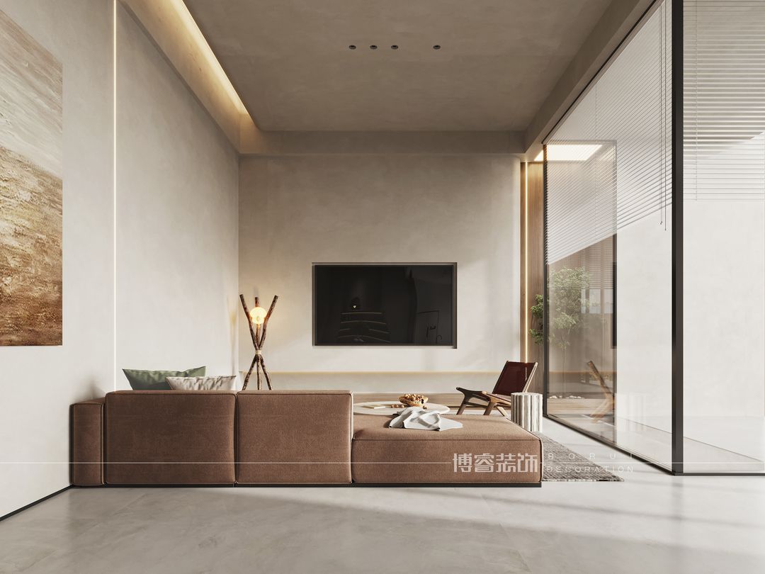 负二客厅的挑空,延伸至办公/吧台区,再由楼梯过渡到茶室,以敞开的空间形式跟生活动线方式形成区域的“软隔断”,赋予空间自由的流通感。