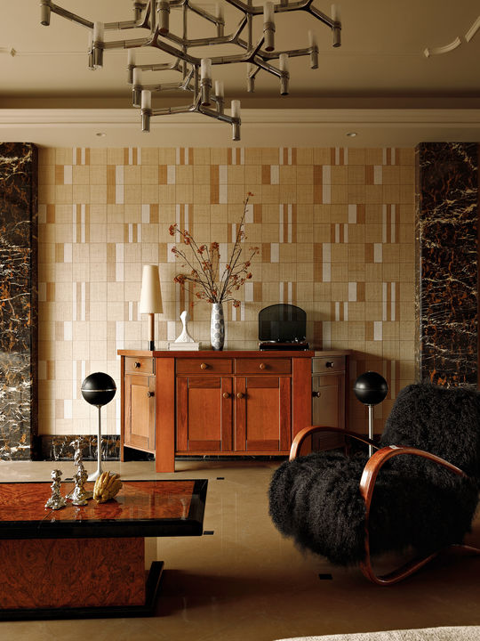 深色木纹收纳柜,增加了收纳空间。灰色地板深棕色木纹收纳柜和黑色钢琴颜色和谐,整个空间优雅又充满高级感。