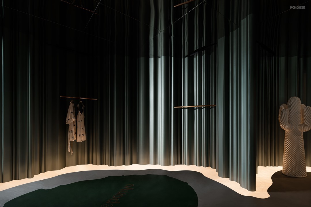 空间选用品牌的基本色墨绿色作为背景基调,如瀑布般倾泻而下的墨绿色隔墙,以丝绸漆模仿真丝内衣质感,拉开了空间的戏剧帷幕,垂坠下绿色华美流光,在地上漾起星河涟漪,自由无拘,蔓延流转。