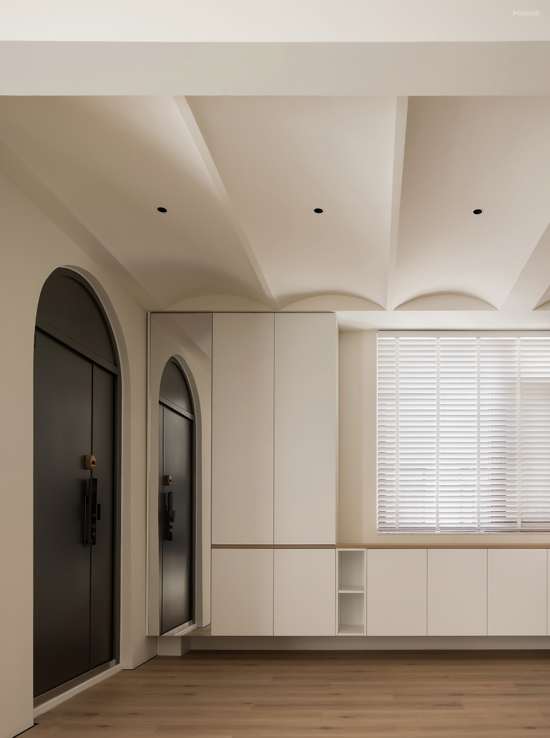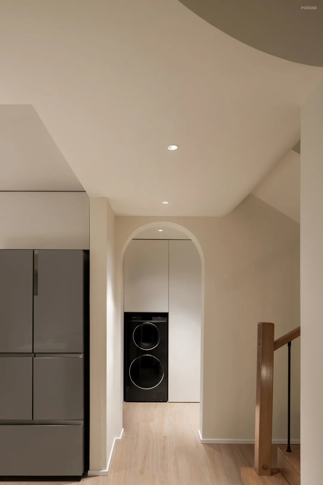 拱形门划分了两方空间,里面是杂物间、洗衣房和卫生间,考虑到动线和美观便规划到了一起。
