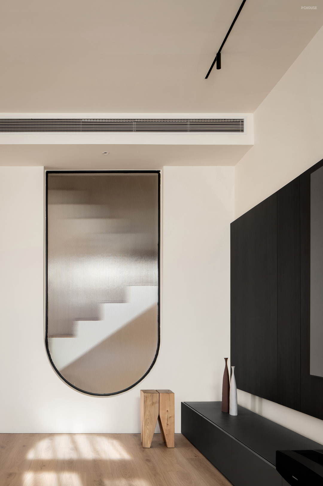 客厅与楼梯一墙之隔,将中间一部分墙面打通安装上长虹玻璃,通透且模糊的材质让楼梯间有了更多的光线和神秘感。