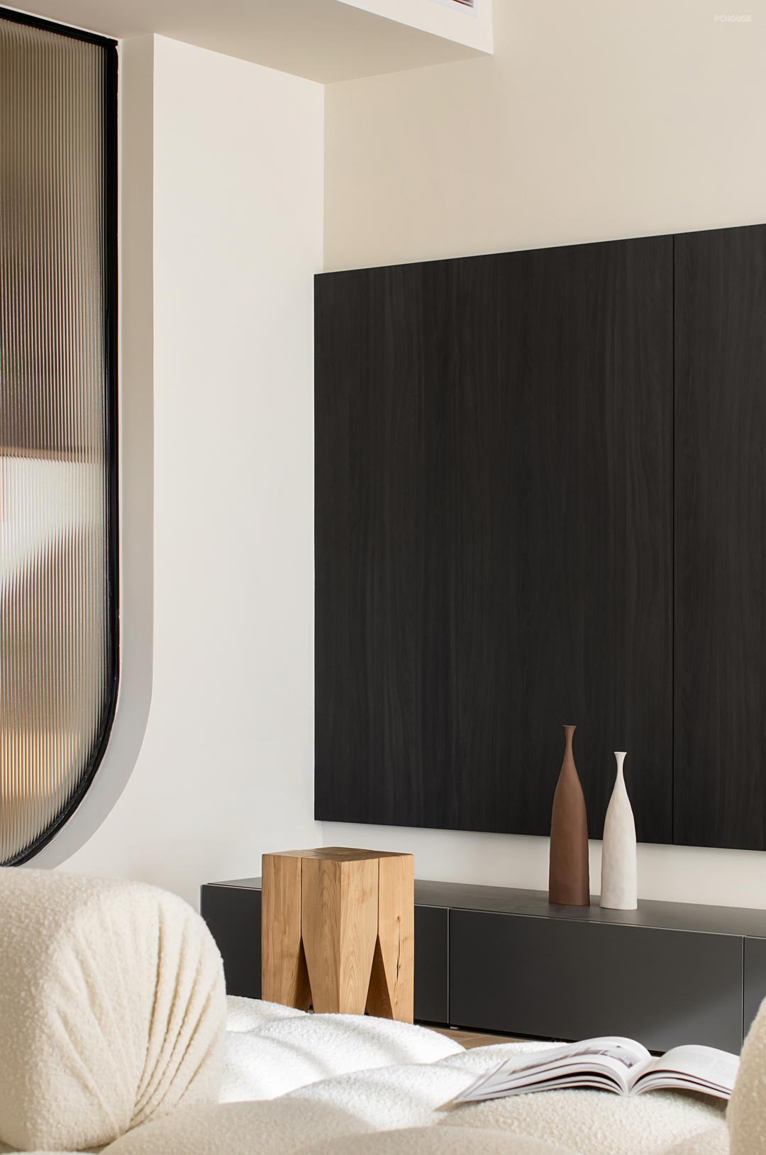 电视机旁用深胡桃木饰面叠起,仿佛一个大画框,让美好画面定格在这一方小空间