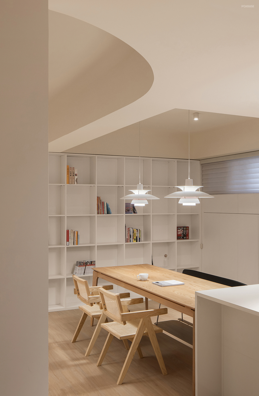 靠墙设计了一排通顶的书柜,和木色桌椅的搭配,使得餐厅也可以变成一个办公学习区。
