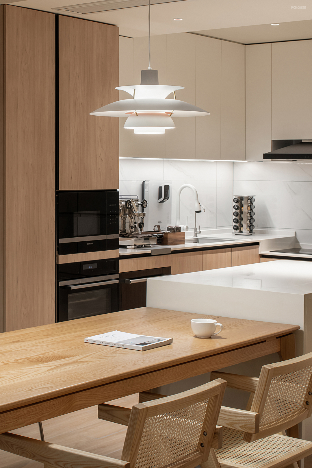 厨房的L型台面可以满足绝大部分的烹饪需求,餐厨柜的木饰面与地板同色,整体保持简单干净的效果。