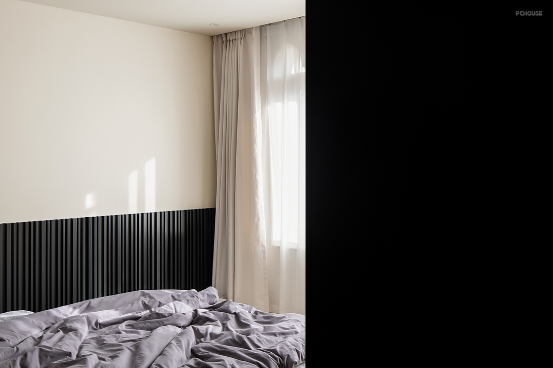 床头板恰如其分的黑色中和了暖色调,其表面的凹凸感也为房间增添了些许艺术感。