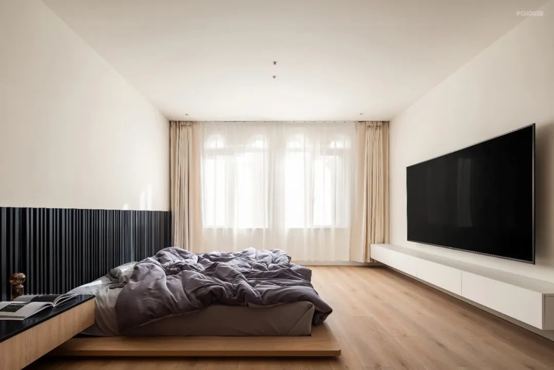 用最简单的色块将卧室的轮廓勾勒出来,床体是地台设计,底部微微挑空安装了灯带增加轻盈感。