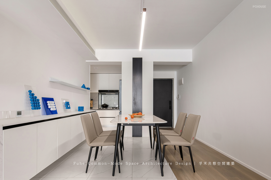 客餐厅采用地板与地砖对拼,自然舒适,同时区分过道与功能区