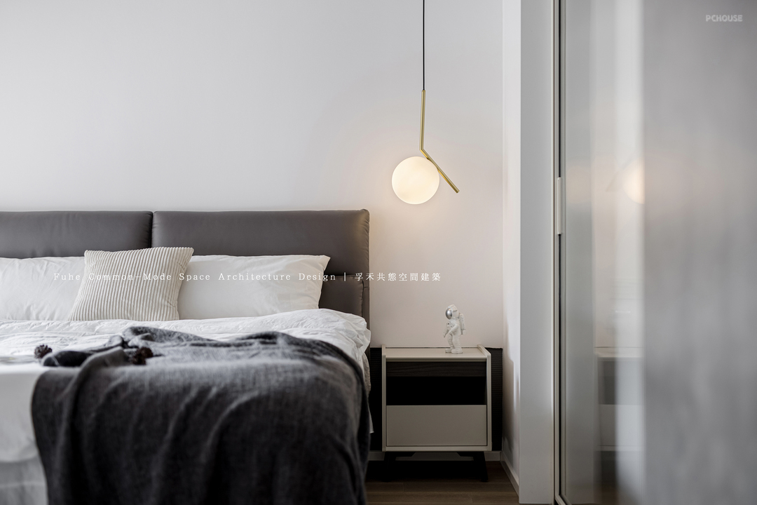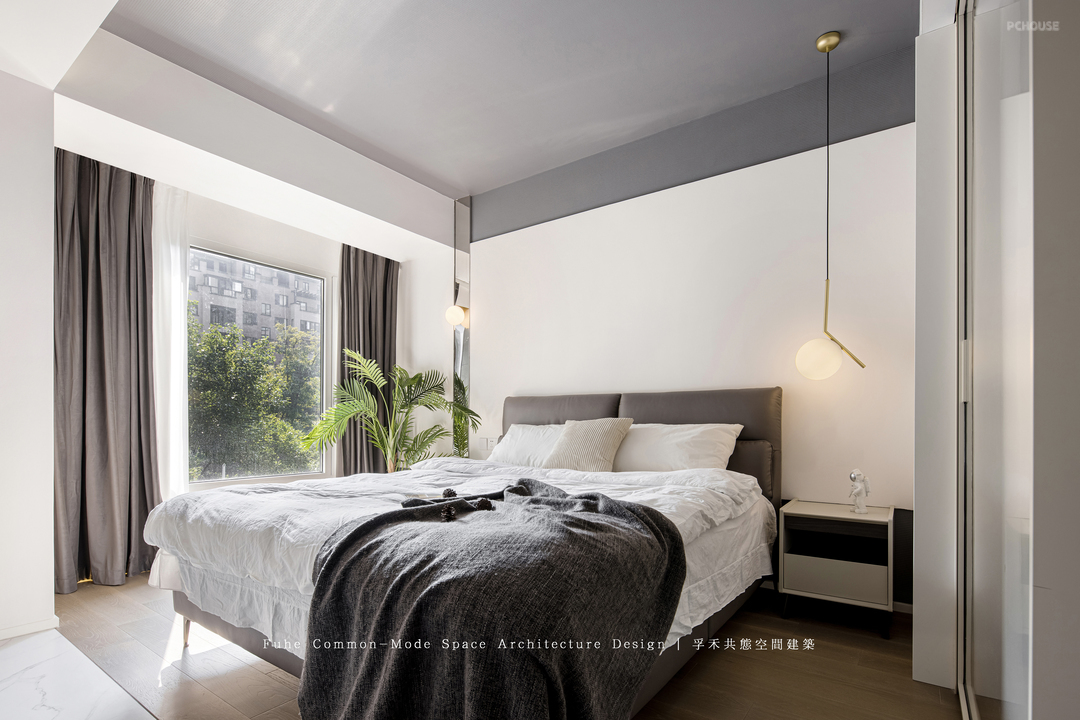 次卧因为空间东西向净尺寸狭窄,所以将床南北向放置,增加空间利用率,同时也集中增大了孩子的活动区,将书桌设置于南北方向,方便光线引入和读写,窗帘纱采用了白色碎花,营造空间氛围