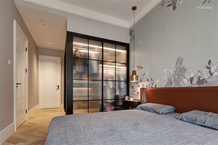 原有卧室的衣帽间由实体墙来区分,无形中会压缩视觉。本案采用黑色边框及彩虹玻璃的应用对空间做了延伸,灯光也很好的丰富了层次。