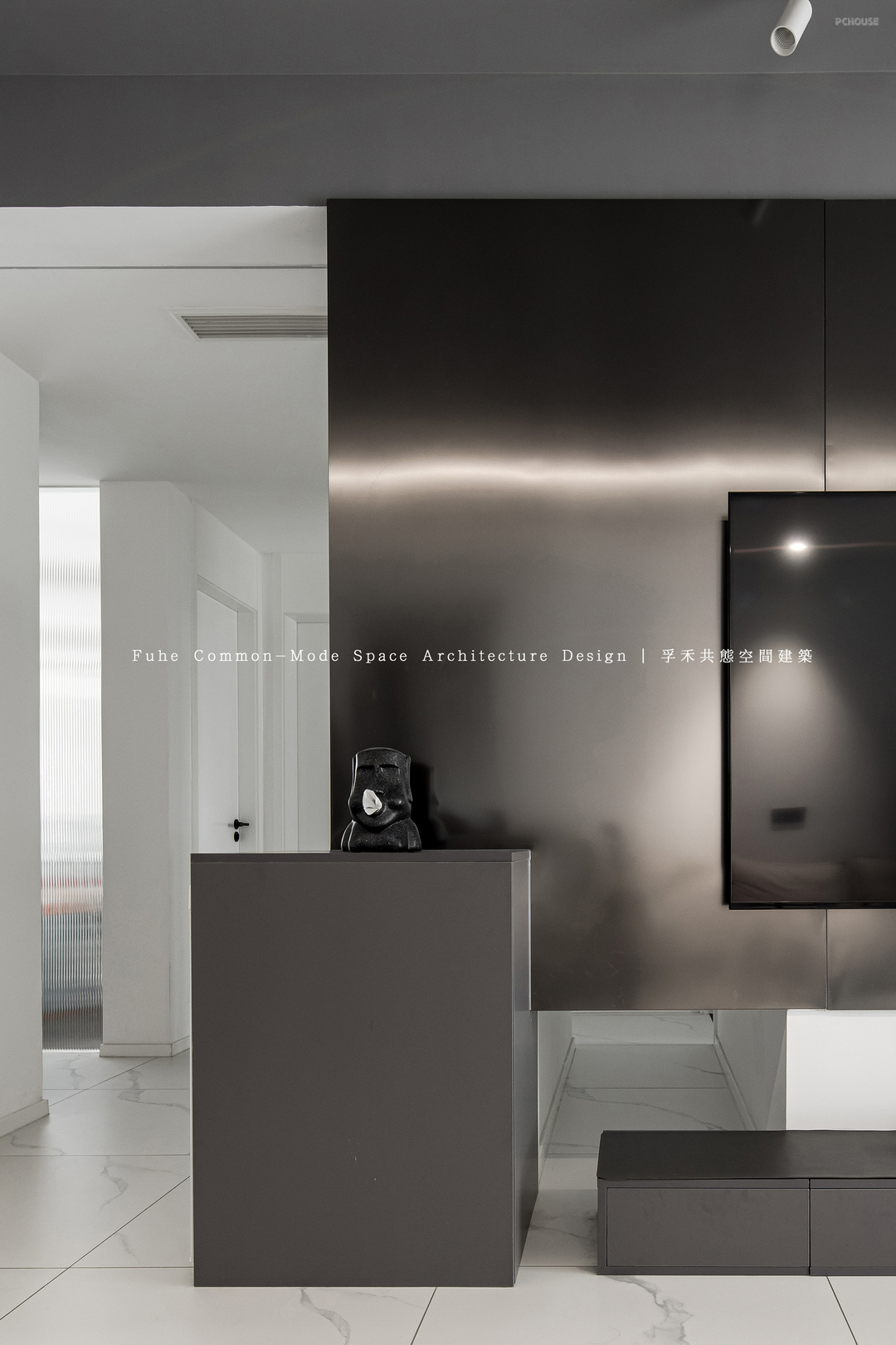 客厅考虑到气流的流通,和猫咪活动的流畅性,空间制作了小型的环形动线,让猫咪们更好的玩耍和穿梭,现代的背景让空间多了更多的时尚感,现代感,电视柜与干区的契合,变化,让功能的使用不再单调,空间的变化让人更加的愉悦