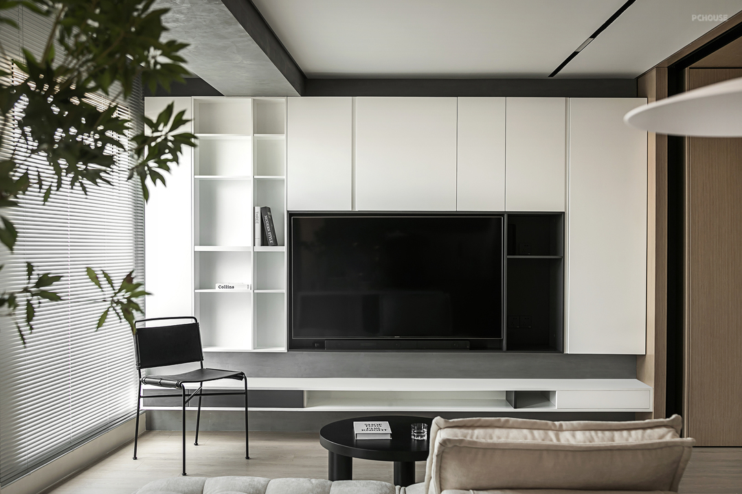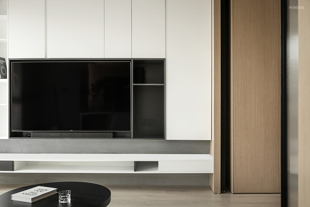 电视墙的设计继续沿用白色为主体的设计元素,搭配灰色艺术漆的背景