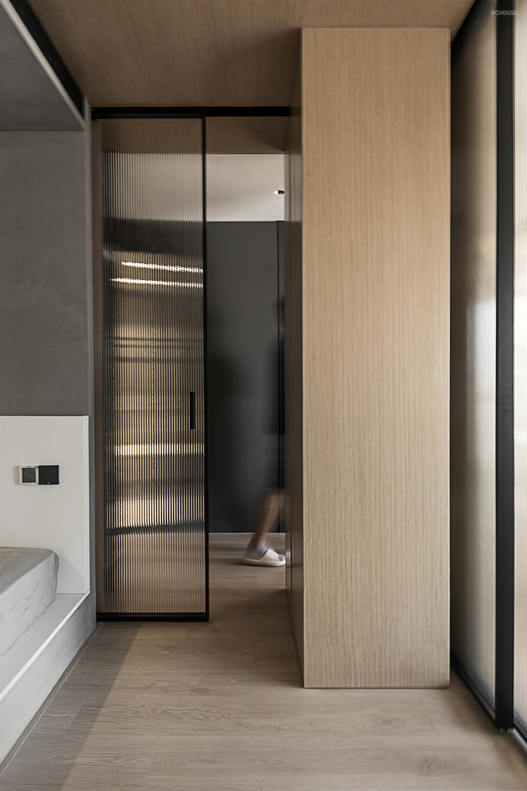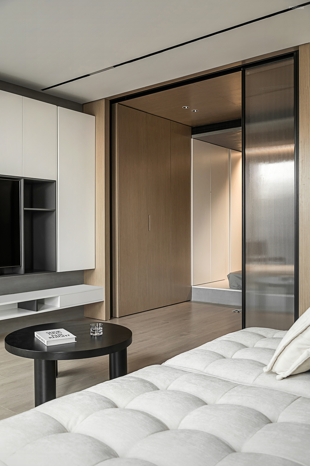 卧室休息区朝向客厅的面,内嵌式双联移门,开启和关闭也让空间本身的关系发生了变化