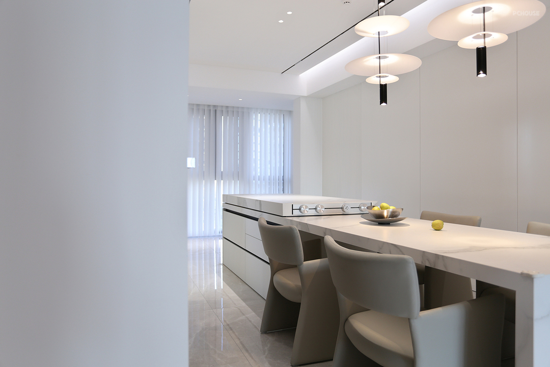 屋主喜爱的大大餐桌+岛台组合,在结构上为穿插样式,通过石材之间的留缝处理,让原本厚重的结构,显得轻盈许多。