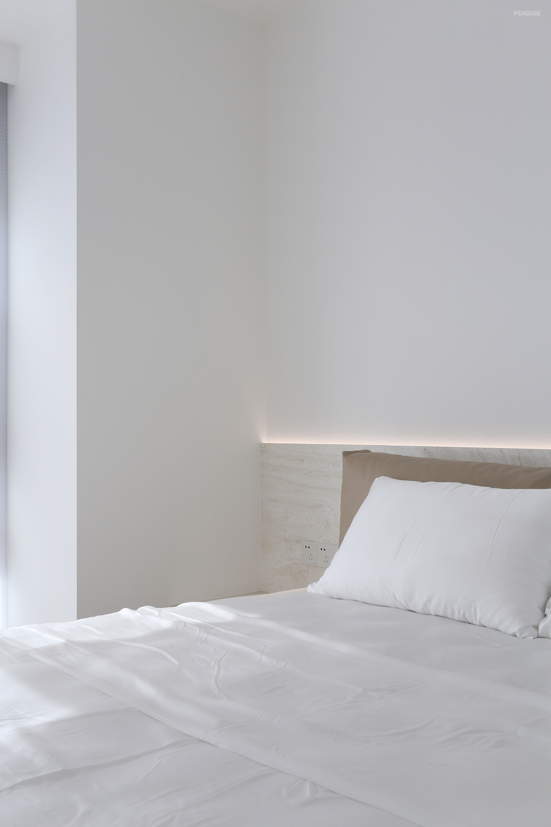 主卧床头石材靠背为现场制作,前期预留灯线,床头阅读小射灯也需要根据尺寸进行预埋,这些都是在设计阶段就需要提前考虑到的部分。