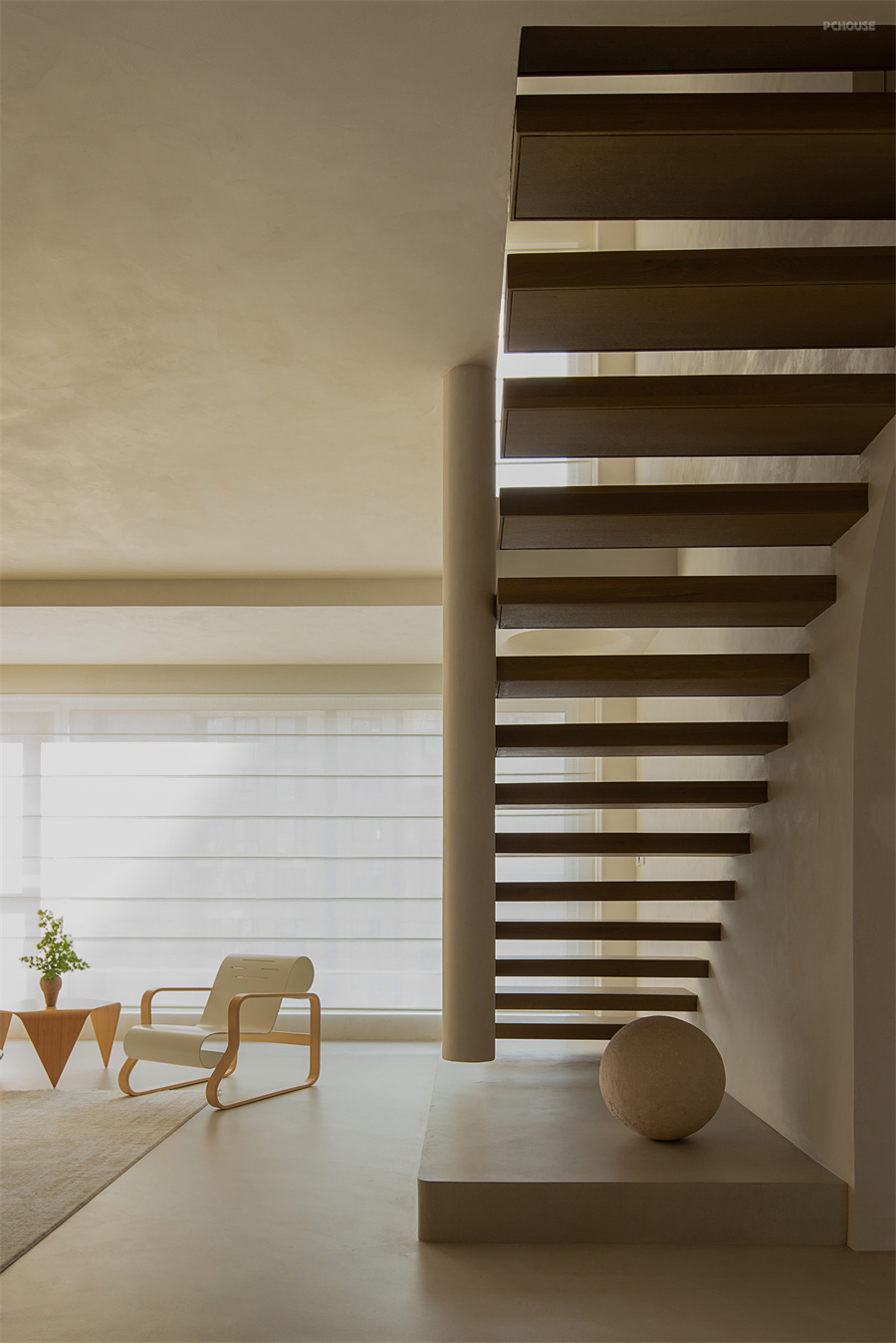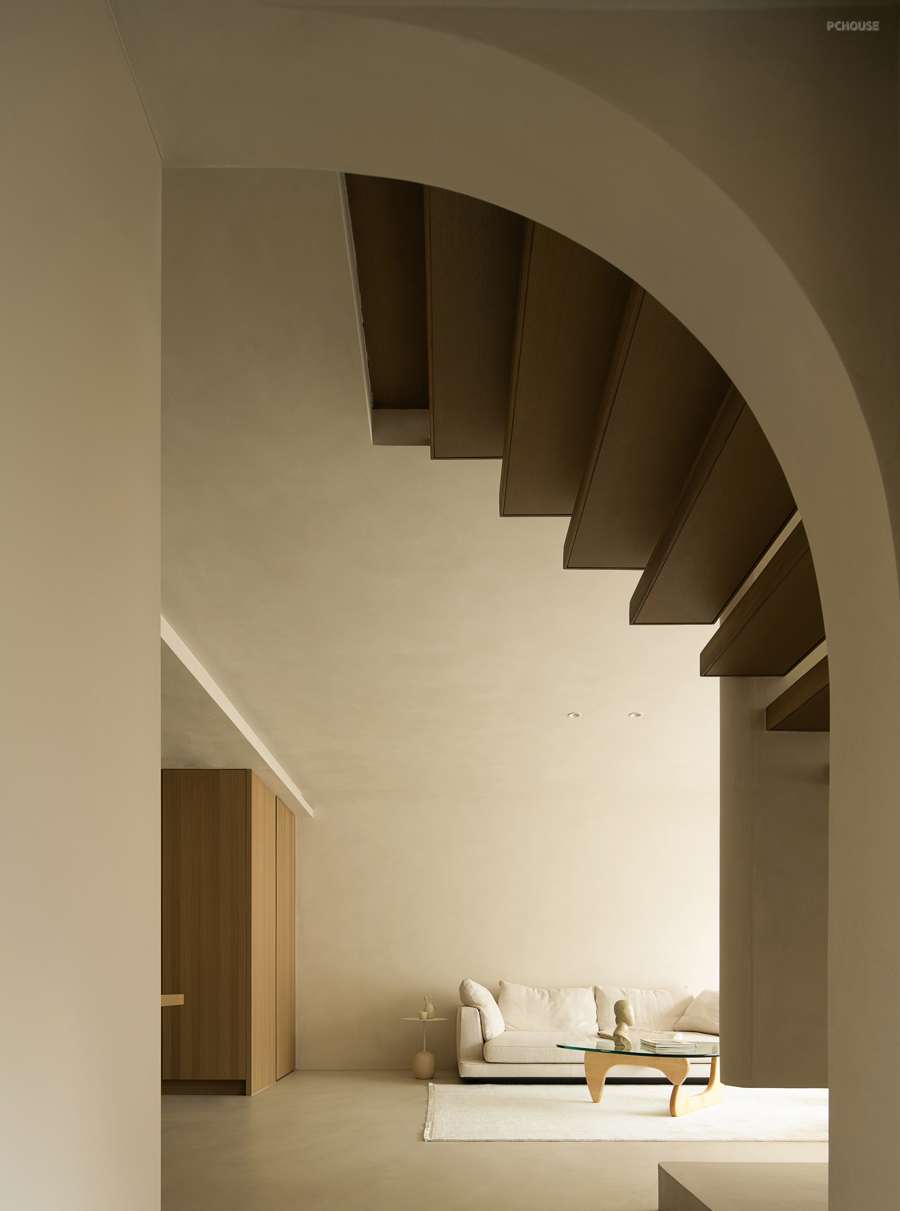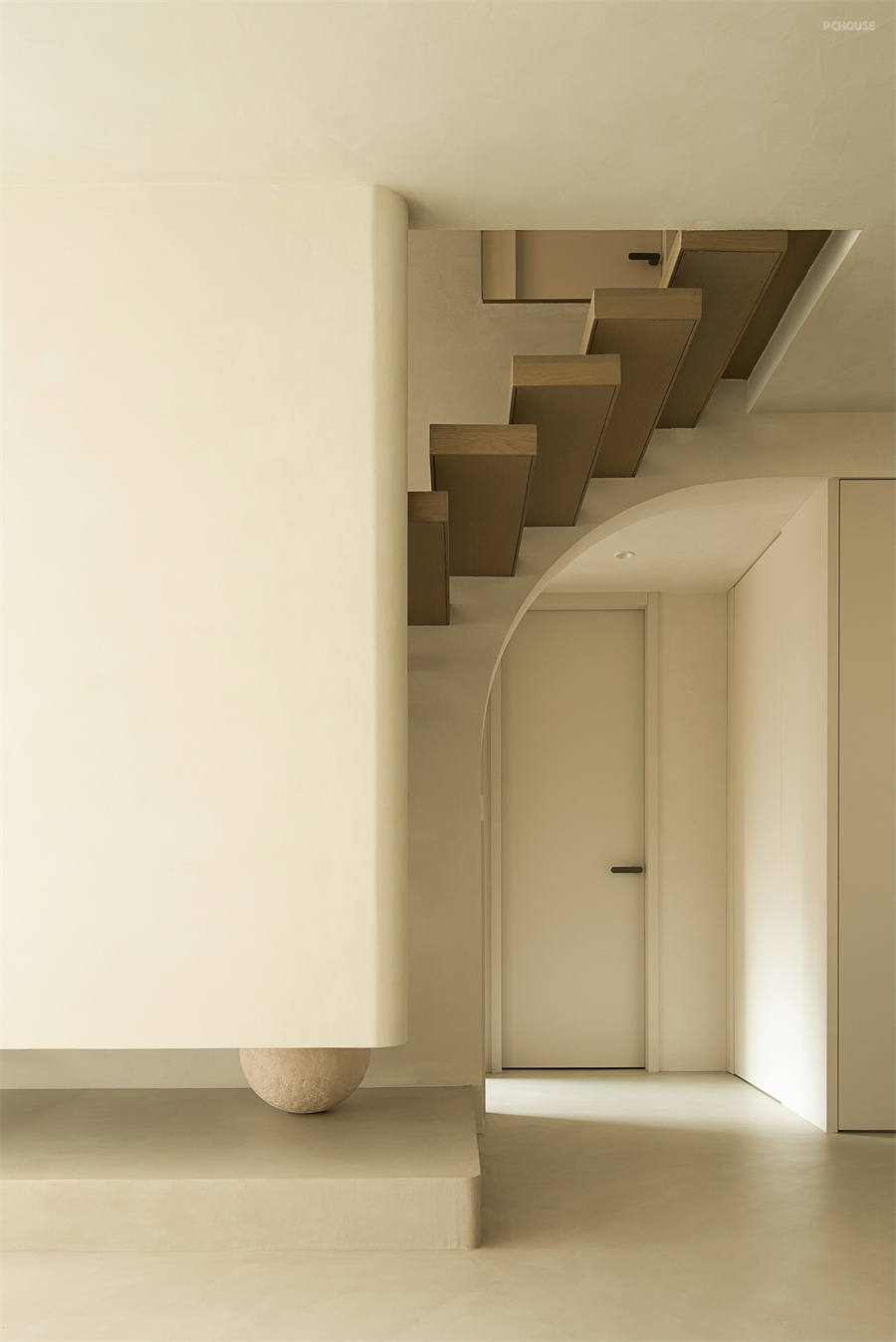 联结两层的空间用一个中空的圆将隔层打通,用圆拱门的形式表达空间动静的分离,楼梯下方一个手工制的石膏球体落下空间的重心,再布局弧形线条的家具维持轻与重的平衡。