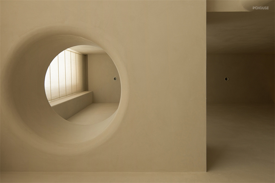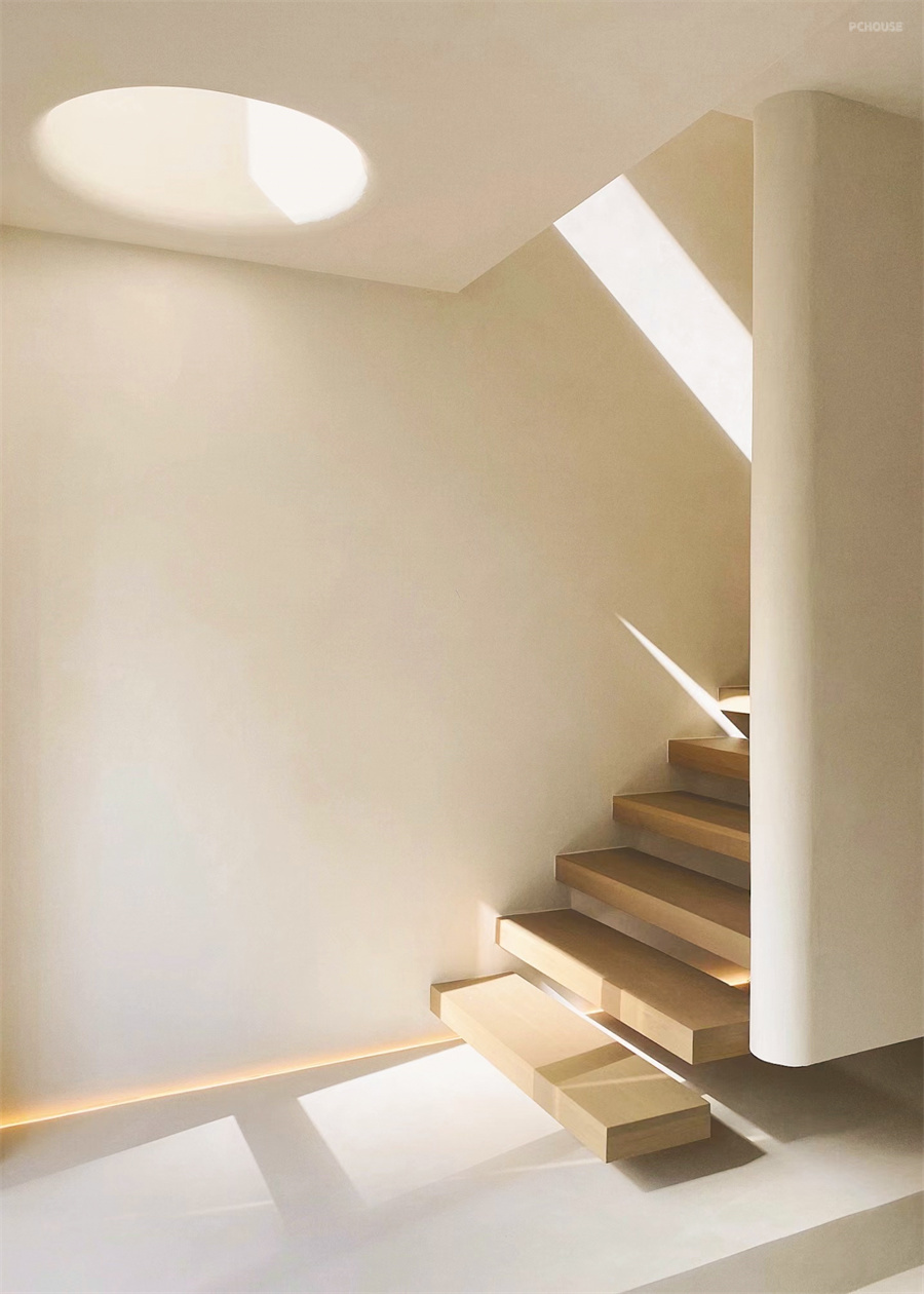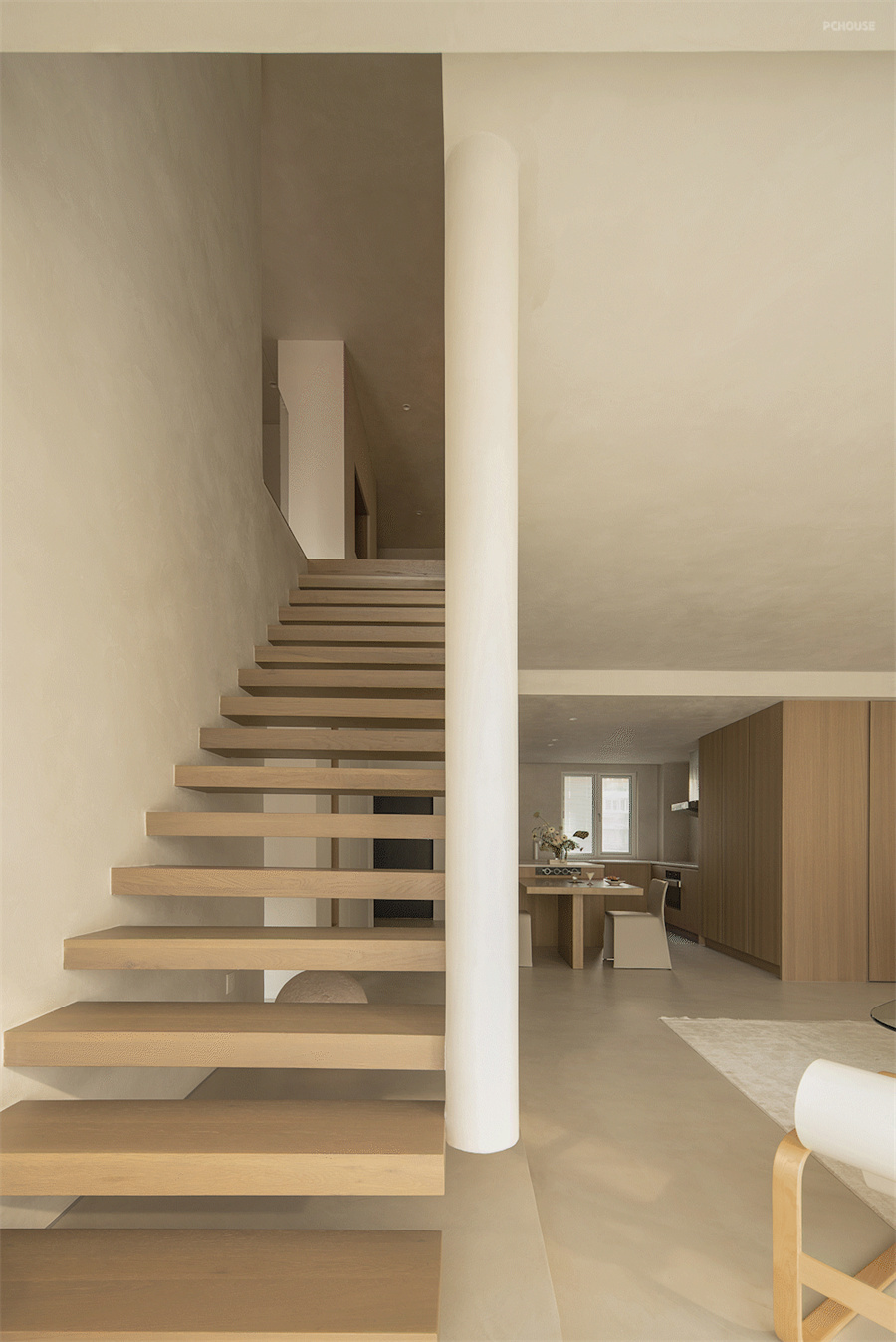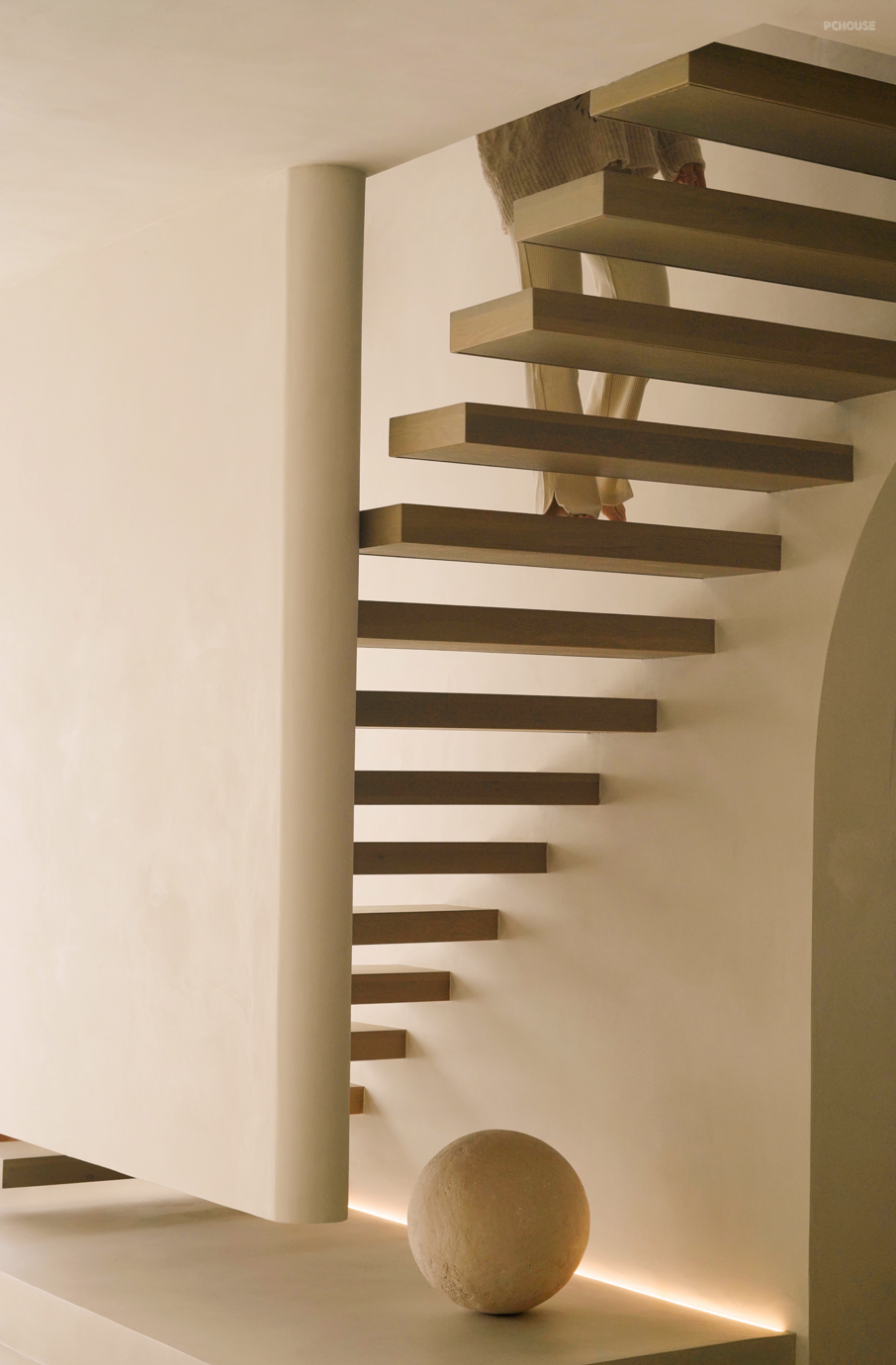 联结两层的空间用一个中空的圆将隔层打通,用圆拱门的形式表达空间动静的分离,楼梯下方一个手工制的石膏球体落下空间的重心,再布局弧形线条的家具维持轻与重的平衡。