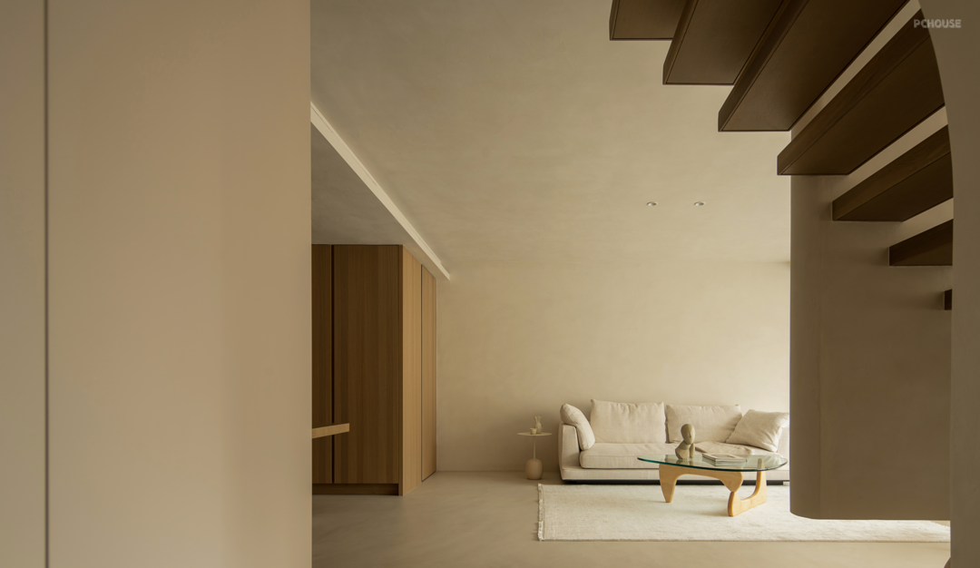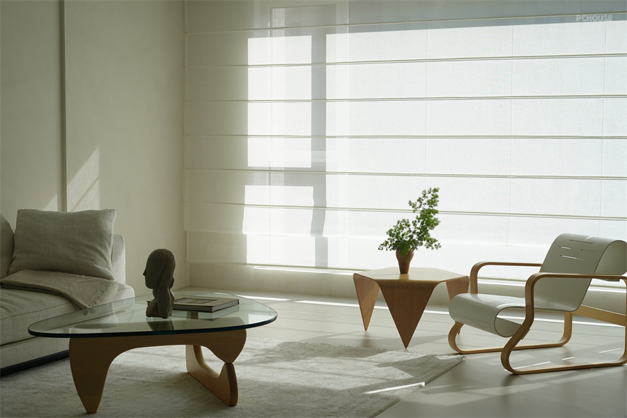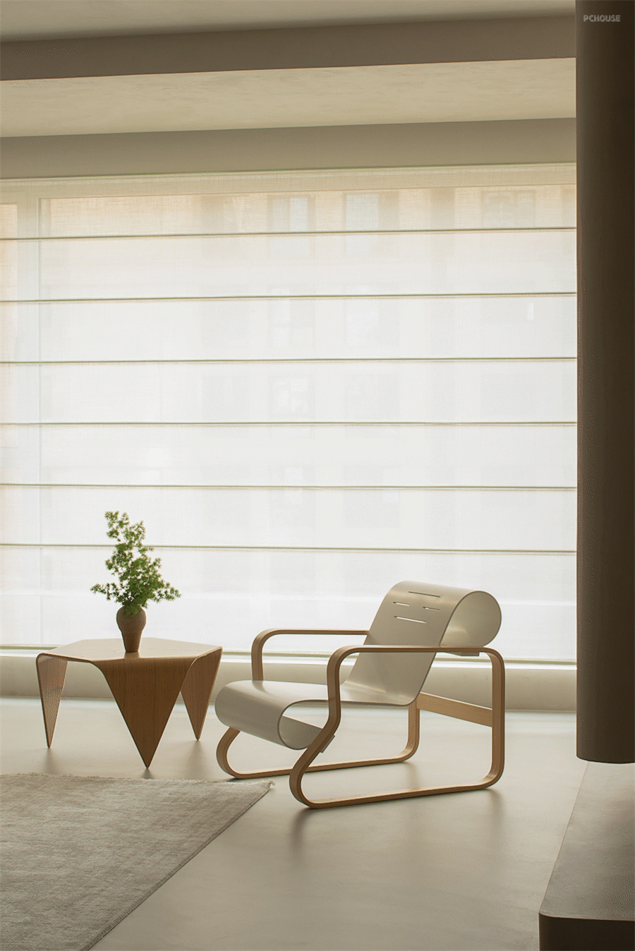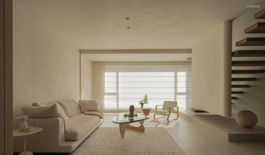 柔和的米白色系微水泥地面与同色系的艺术涂料相融合,形成温柔的感知。客厅朝南的窗户作为空间最主要的光线来源,春夏秋冬、日出日落…通过罗马帘的升降,让空間的光得以持续流动,以此传递家的温润质感。