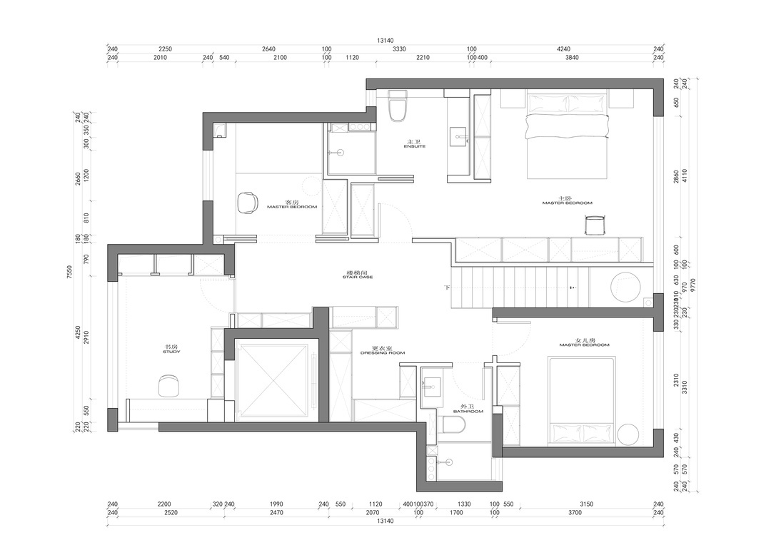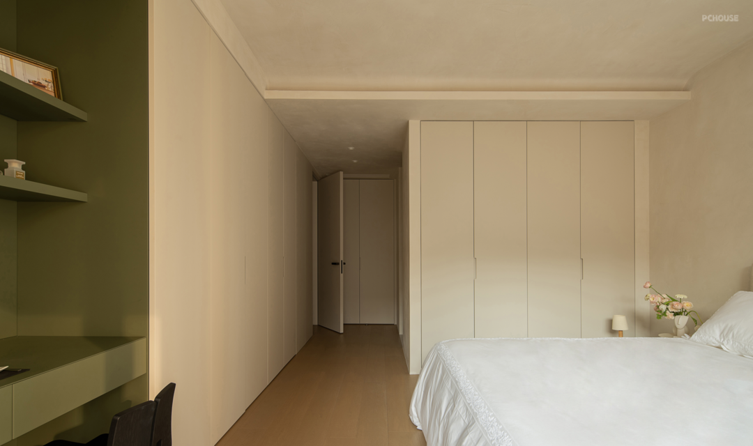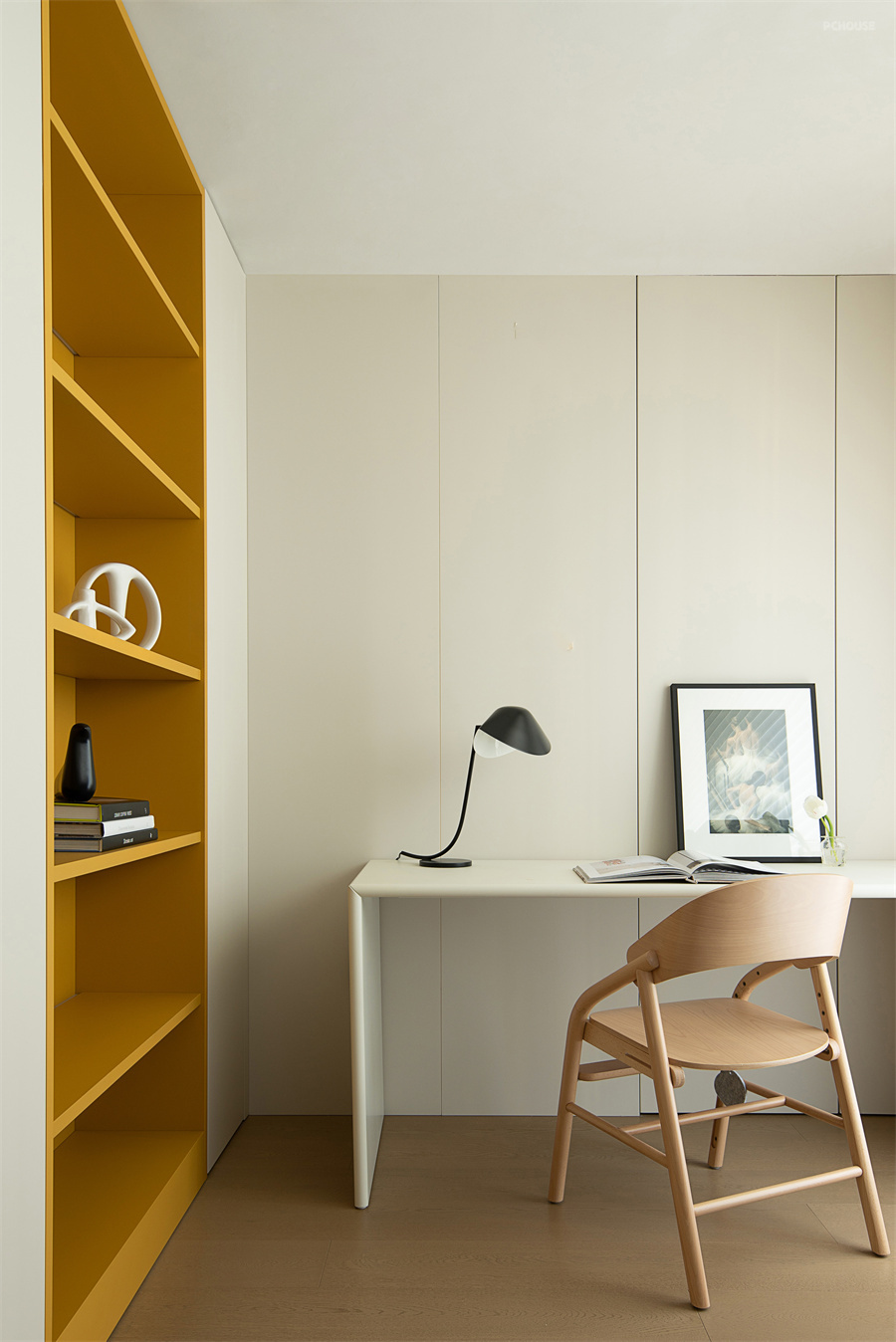 二层是私密的起居空间,我们将更多的目光聚焦于构建个人与空间的关系。我们把孩子的卧室和书房空间分开,同时将其中一个书房墙体打通 用一个可以消失于墙体的推拉门做成灵活空间。既是书房,又可以作为家庭的储物空间,同时若有到访的客人也可作为临时的休息场所,日常则保持敞开。