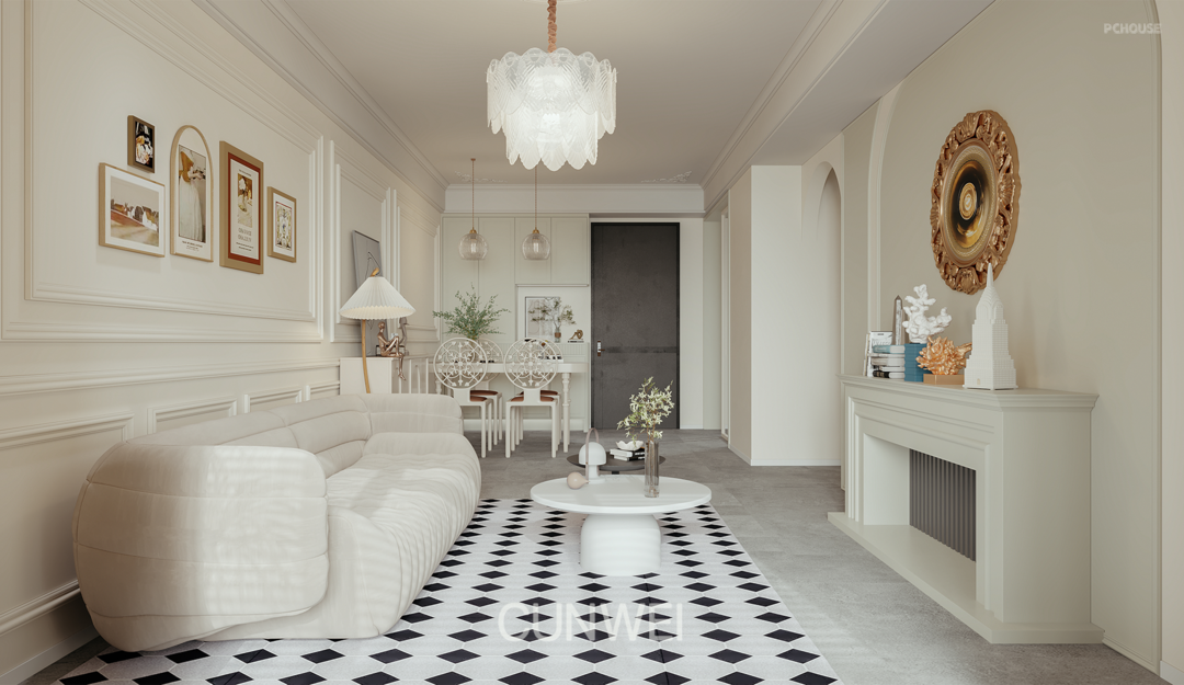 以白色为基调的客餐厅,搭配石膏线条和弧形元素,营造出浪漫而优雅法式氛围,简约的家居配饰与浅色调结合则让整体空间更为恬淡舒适。
