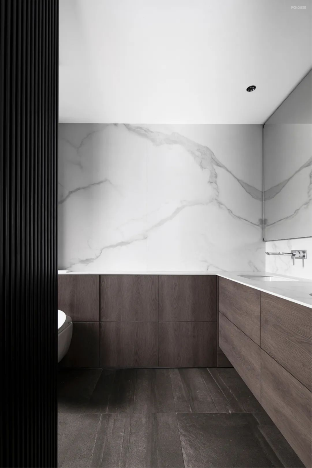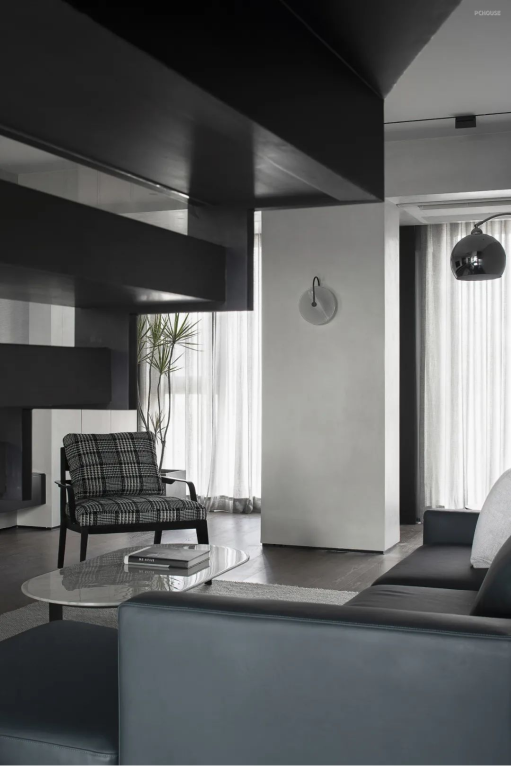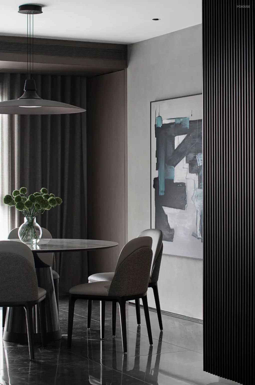 色彩是空间的情感基调。而如何让深色的空间不压抑,不逼仄。首先是结构上开阔流畅,尽量减少隔断,还视线一片清明。其次是自然光与人造光的合理搭配,营造明亮舒适的居住体验。另外还有线条的流畅纤细,可以弱化厚重感,增加空间精致质感。