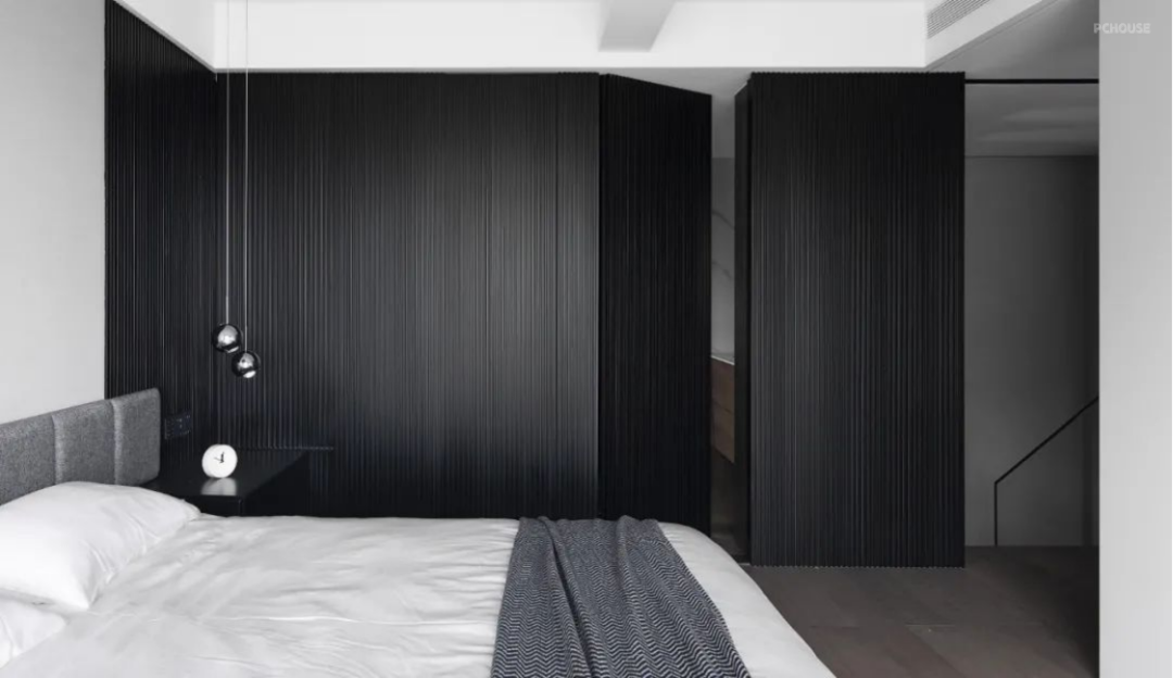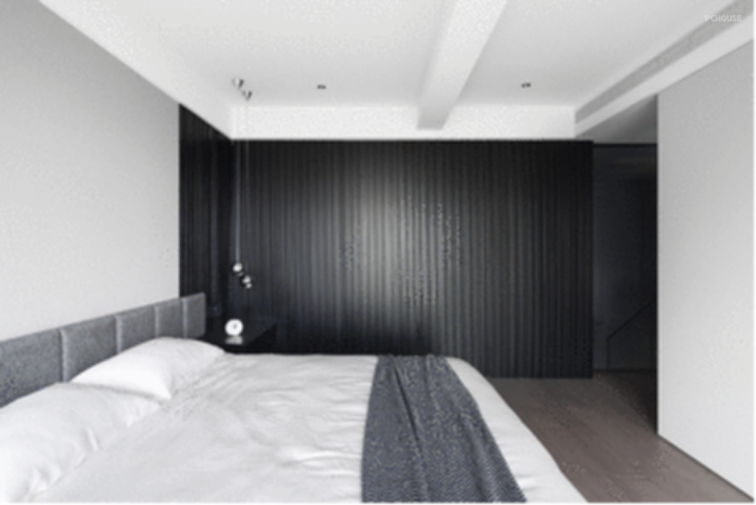 以不同深浅的灰,构成层次分明的空间语言,而地面烟熏橡木色地板,营造属于卧室的温馨情境。