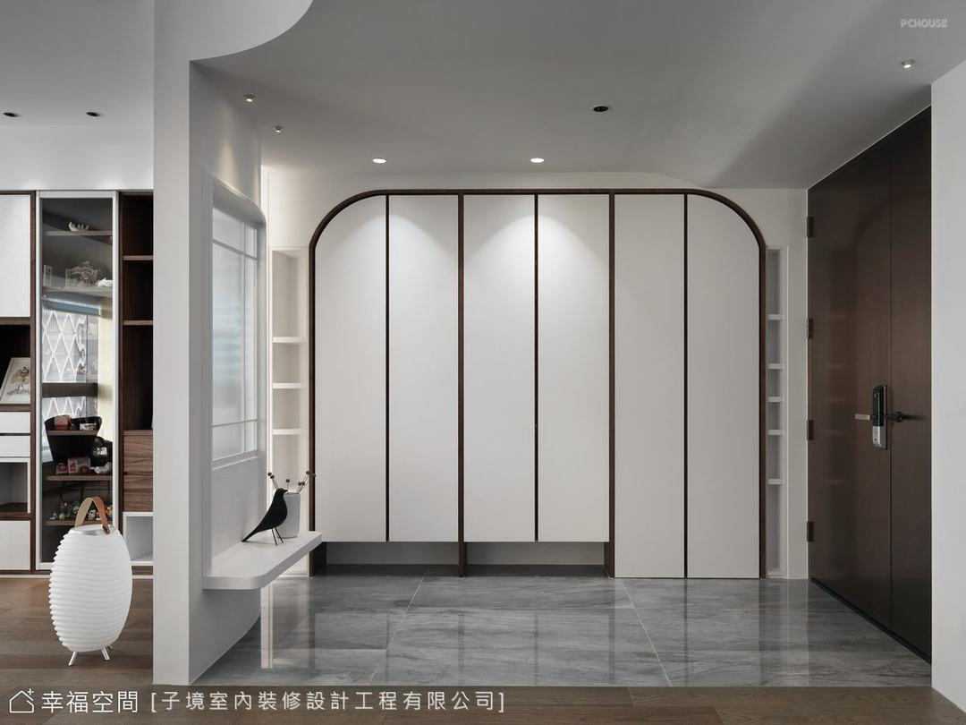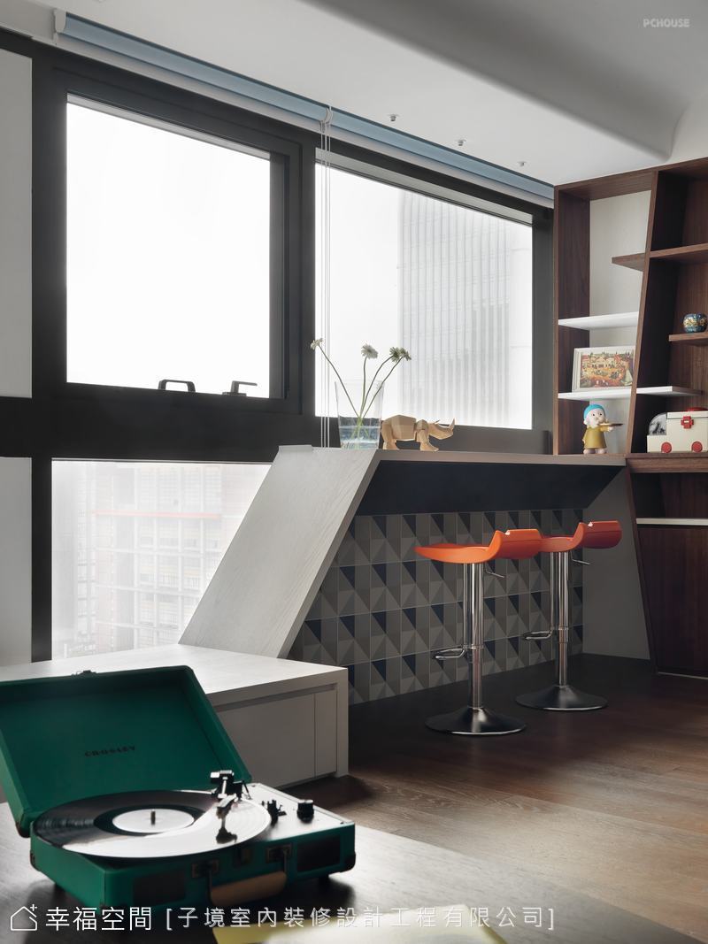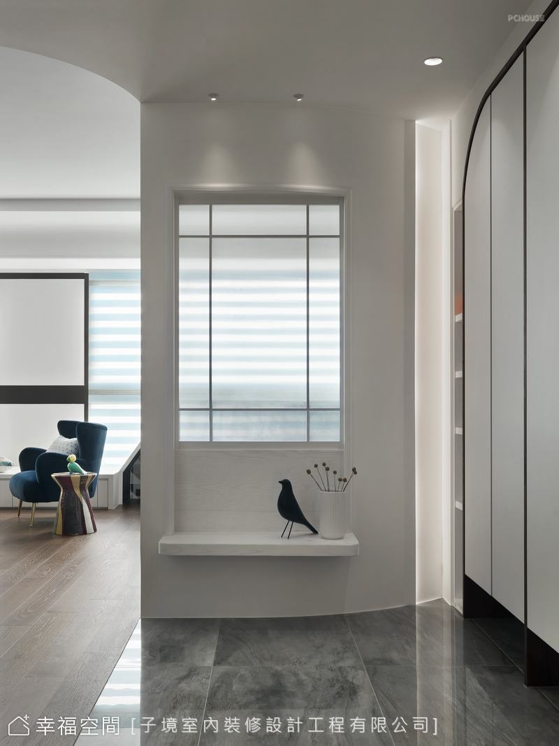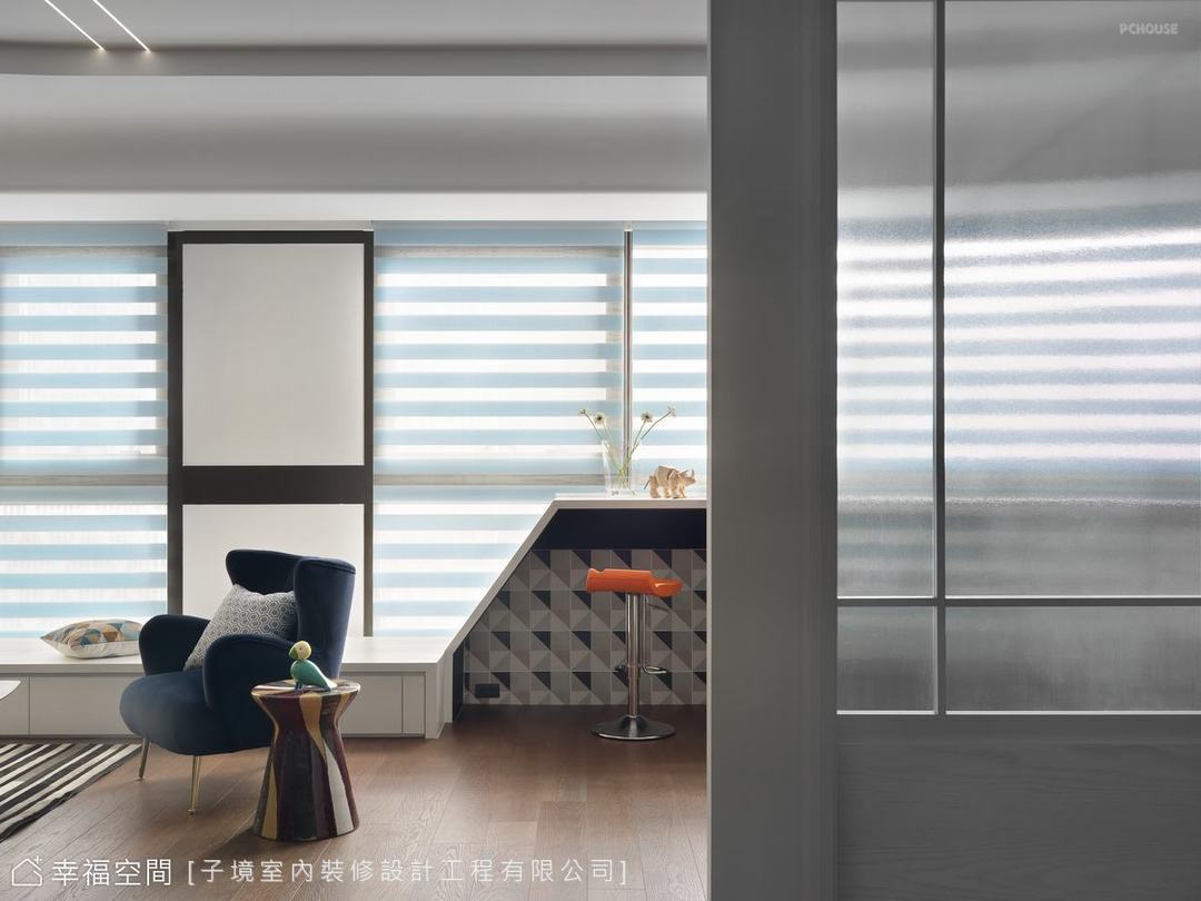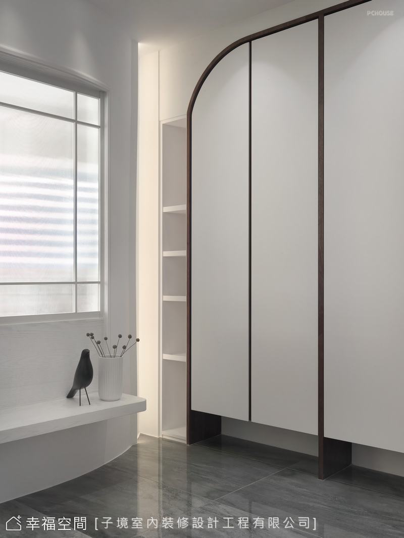 自玄关入室,彷若咖啡厅坐台等候区的设计,入内即能放下一天的疲惫,整面的弧形鞋柜兼具了美型和机能。敞朗的客餐厅以黄色、蓝色界定了各别场域,褪去电视墙设计,而是以错落收纳展示柜墙规划作呈现,搭配上临窗的吧台设计和卧榻,皆描绘出屋主对于轻松惬意的生活态度。餐厨区则配置了完善的厨具规划,就连防溅墙也选用地铁砖,让屋主回忆过往留学时的生活感之馀,更将屋主留学时釉画作品也镶嵌在炉灶前,成就出独一无二的专属设计。