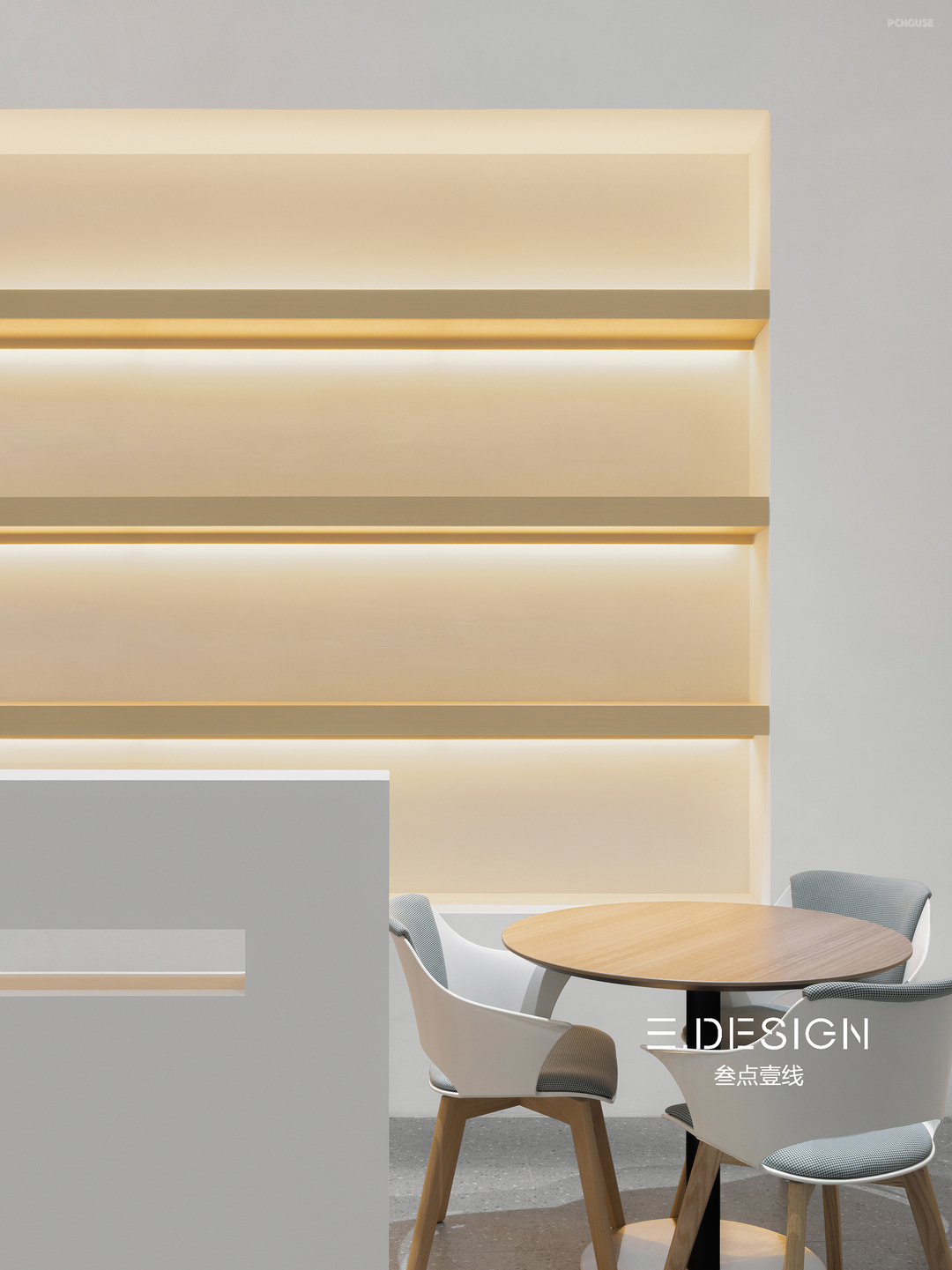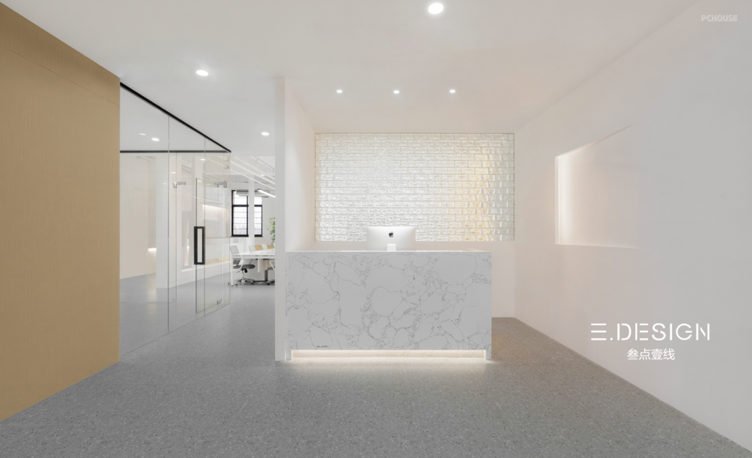 以玻璃砖为背景,将前台与办公区域相隔,大面积的留白直抒胸臆。点、线、面的光影组合,营造出极富纹理感和层次感的灯光氛围,与简约的形式质感相辅相成。