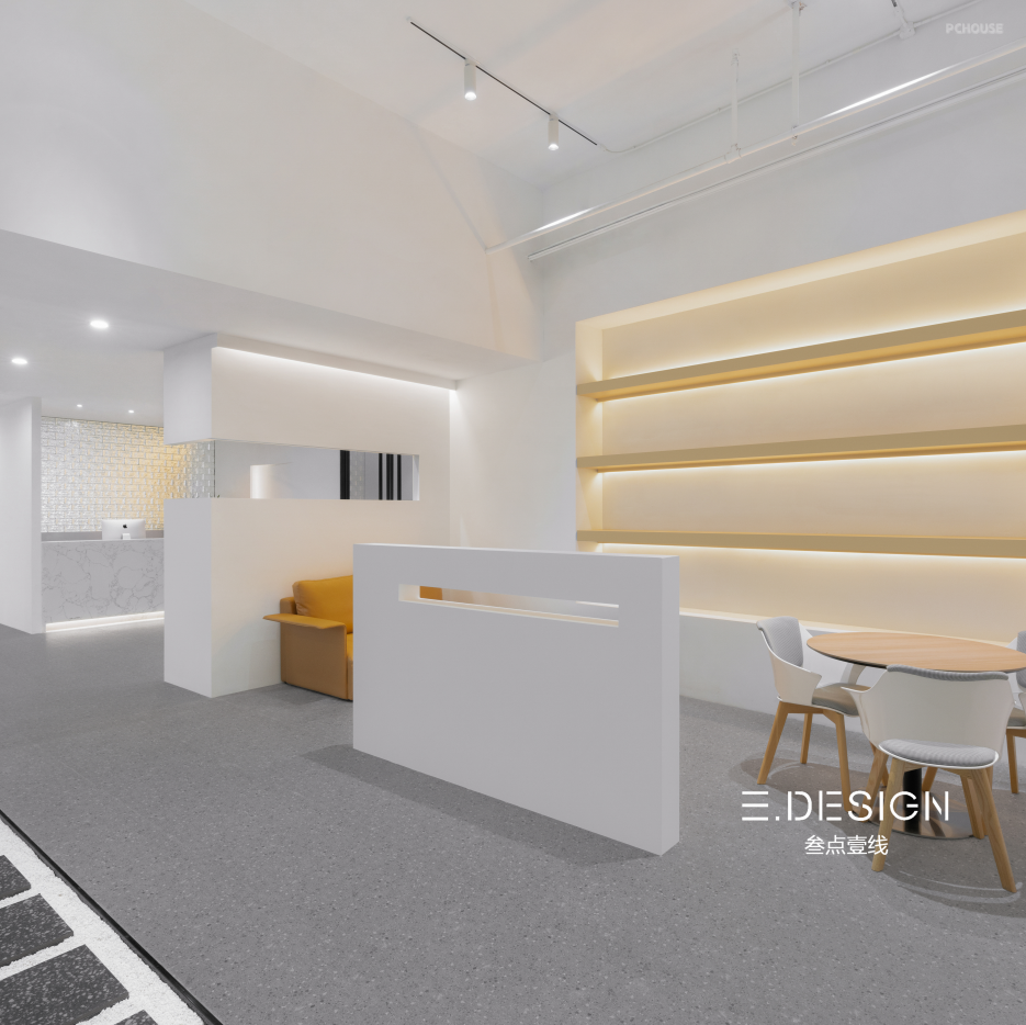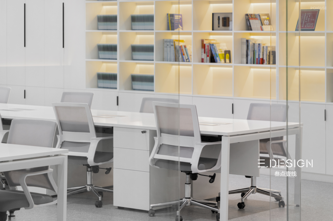 With glass tiles as the background, the front desk is separated from the office area, and a large area of white space is directly expressed in the chest. The combination of light and shadow of points, lines and surfaces creates a lighting atmosphere with a strong sense of texture and layering, which complements the simple formal texture.