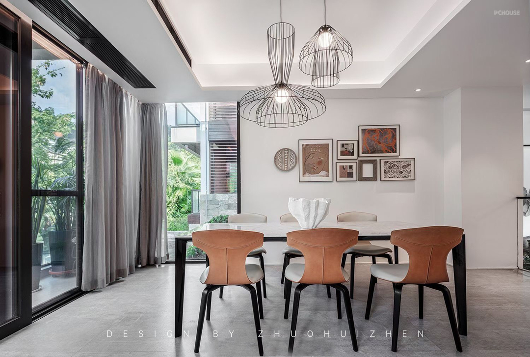 客厅作为主要的社交区空间,借由开放式的格局设计和中国古代造园技艺的“框景”手法来创造出开阔的建筑外景致,以建筑设计手法,冲破空间桎梏,于现代极简中,酿出与众不同的摩登美学意境。