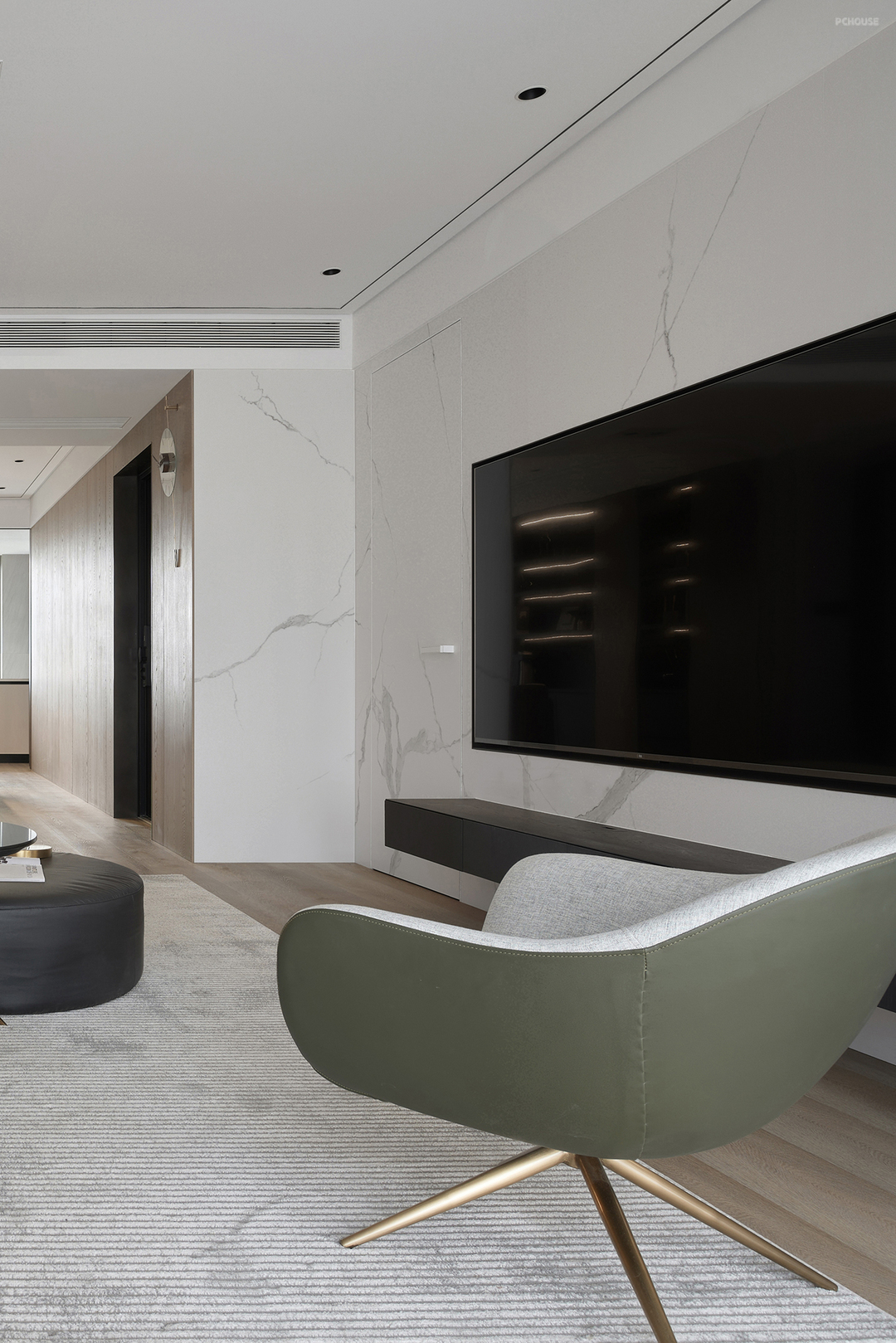 客厅电视背景墙以大块面的岩板呈现,延伸扩展至转折面,以及岩板隐形门设计,模糊了空间界限感,引导视觉感知维度。