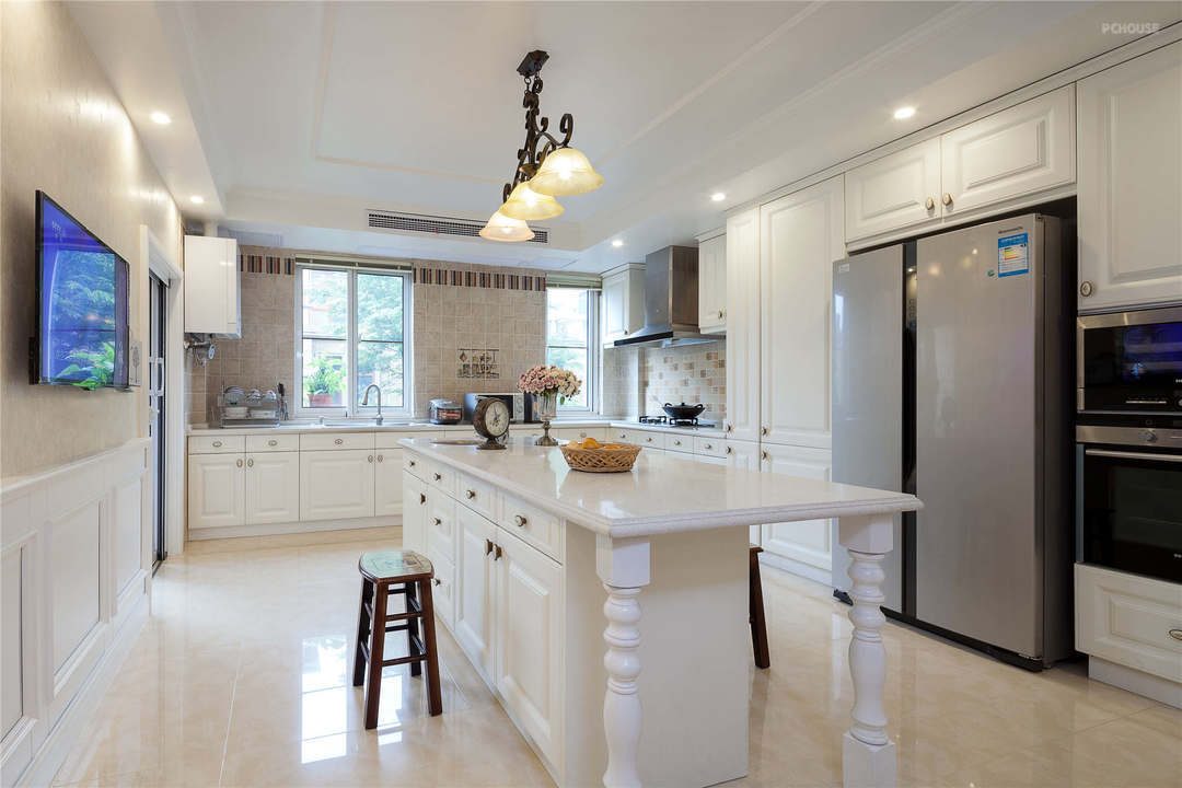 嵌入式冰箱,嵌入式电器,嵌入式电视让空间浑然一体,让收纳操作更加有效合理,动线明朗,顺畅。黄色木地板搭配白色橱柜,合理利用绿植点缀,使整个空间清新自然,简单的欧式线条意在体现简欧之美。