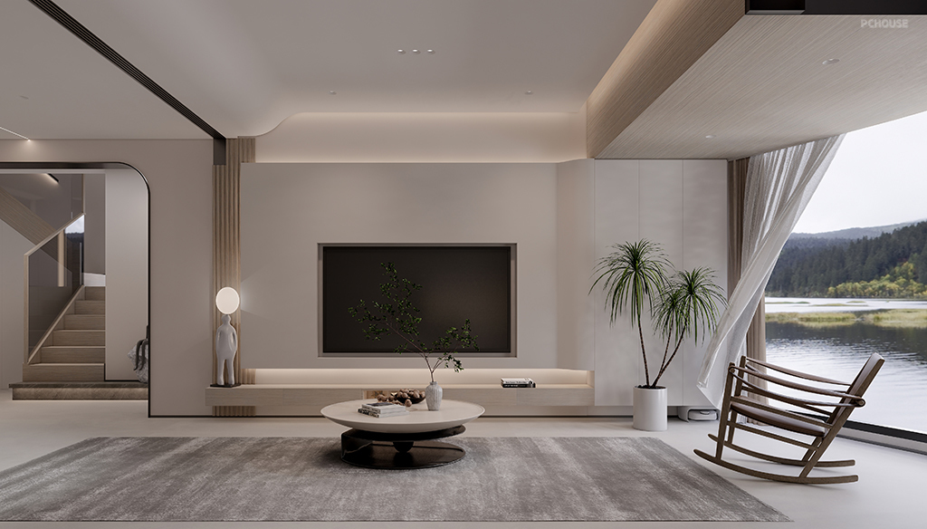 简约自然的家居风格,质朴清淡的色调排布,正与窗外的湖光山色相宜。吊顶简洁的梁位处理,隔而不断的造型分割,让空间整体区域划分于清爽明快中显露出一丝柔和与温暖。