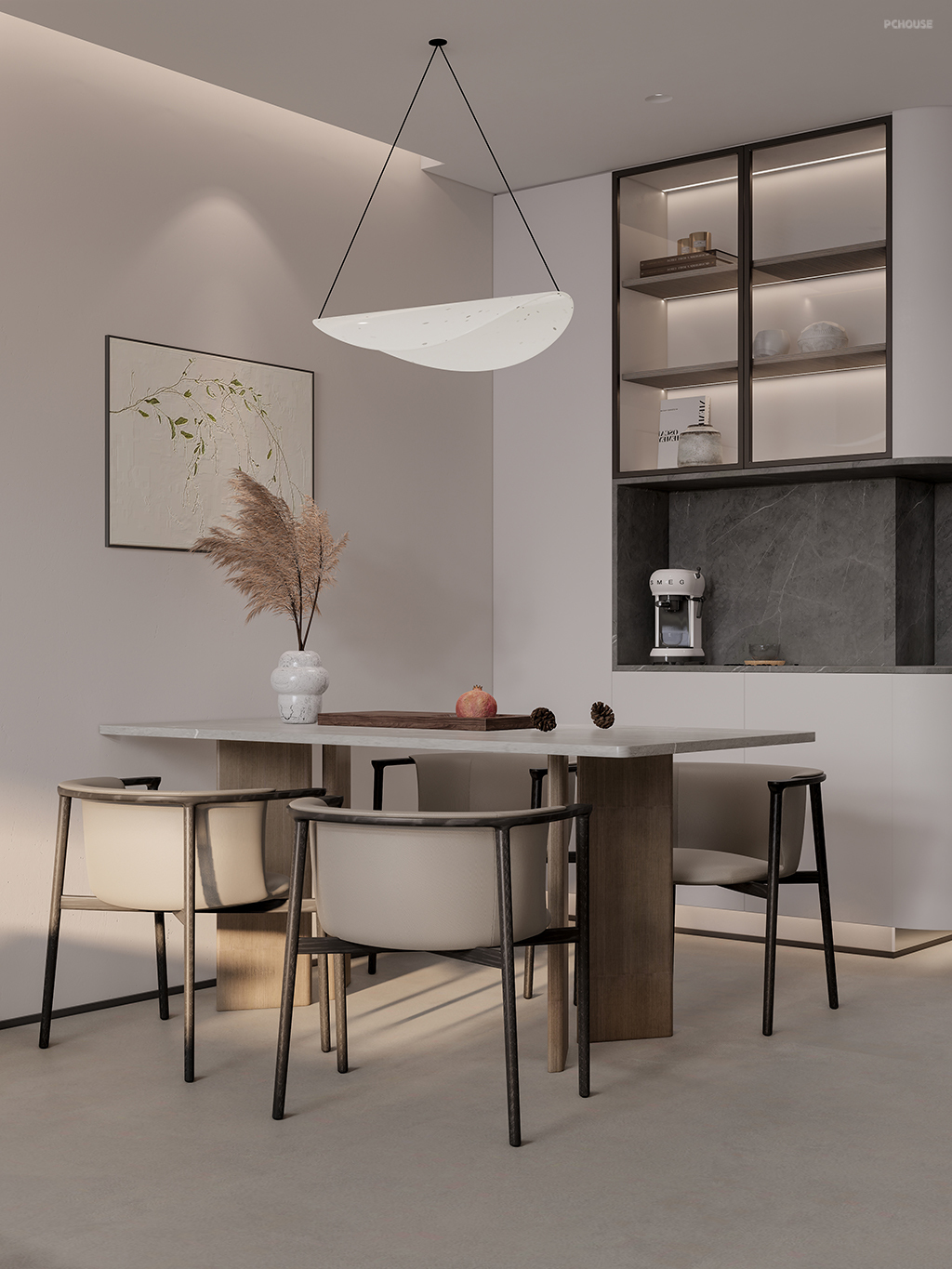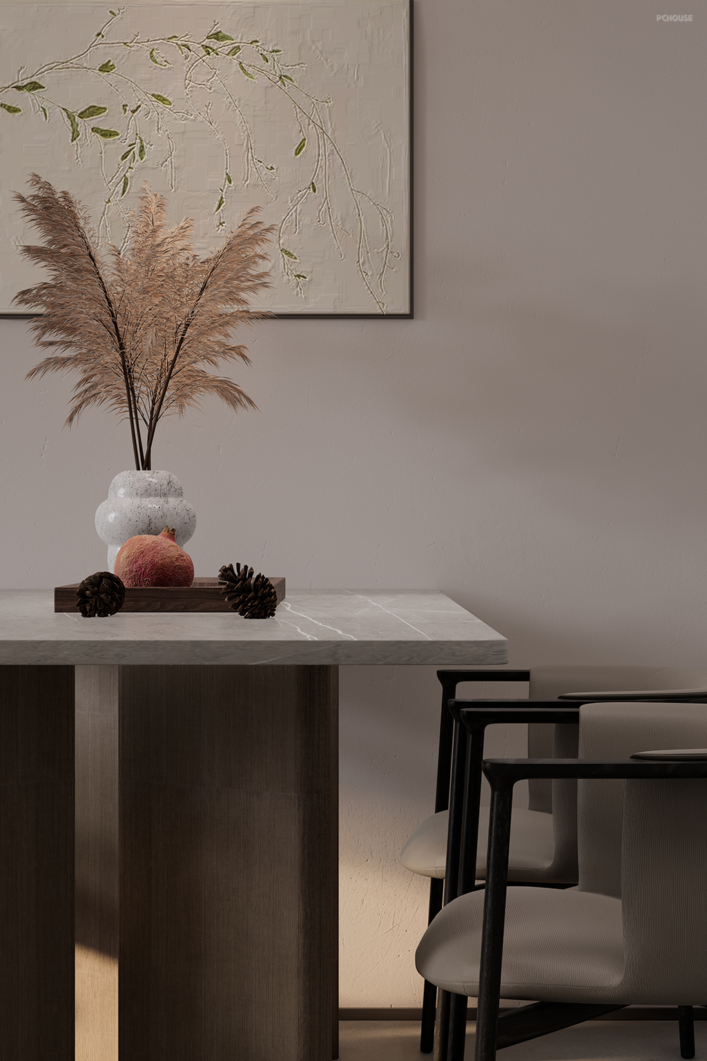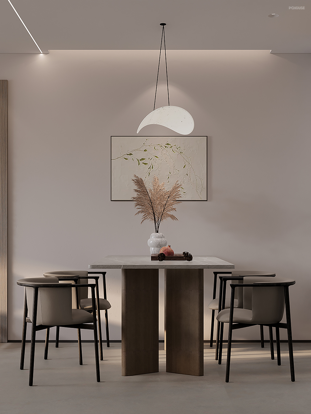 餐桌风格简约,紧贴墙壁,搭配简单画作,设计利落清爽。矮背餐椅收纳时藏入桌下,拓展视觉空间,圆弧形状靠背,为整体氛围添上一抹柔和气质。