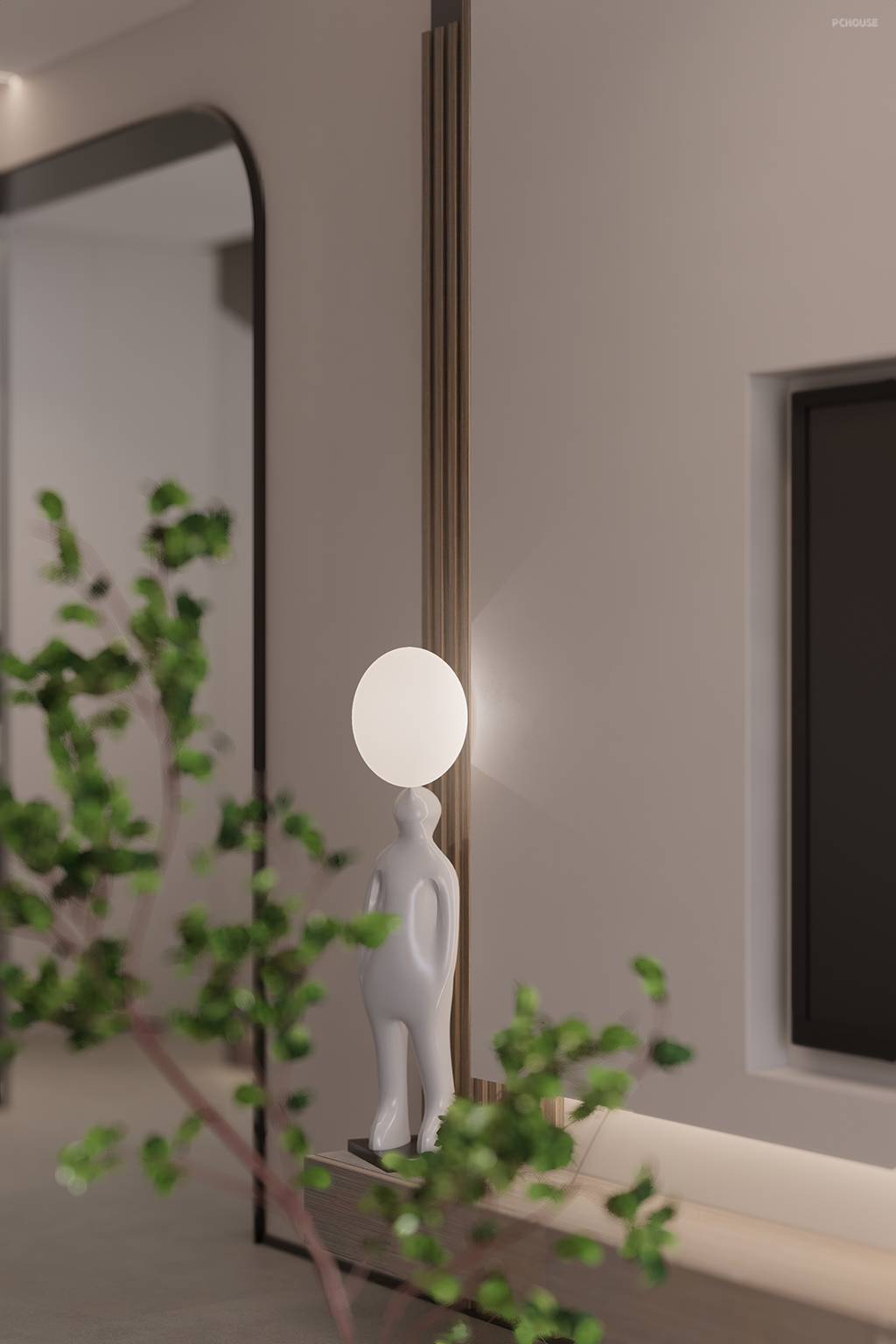 电视墙两边的绿植,为浅淡自然的整体风格添上一抹属于生命的绿意,闲暇时侍弄花草,不失为一处清雅爱好。有趣的灯饰于细节处显出灵动活泼,调节浅灰色调的淡墨气质。