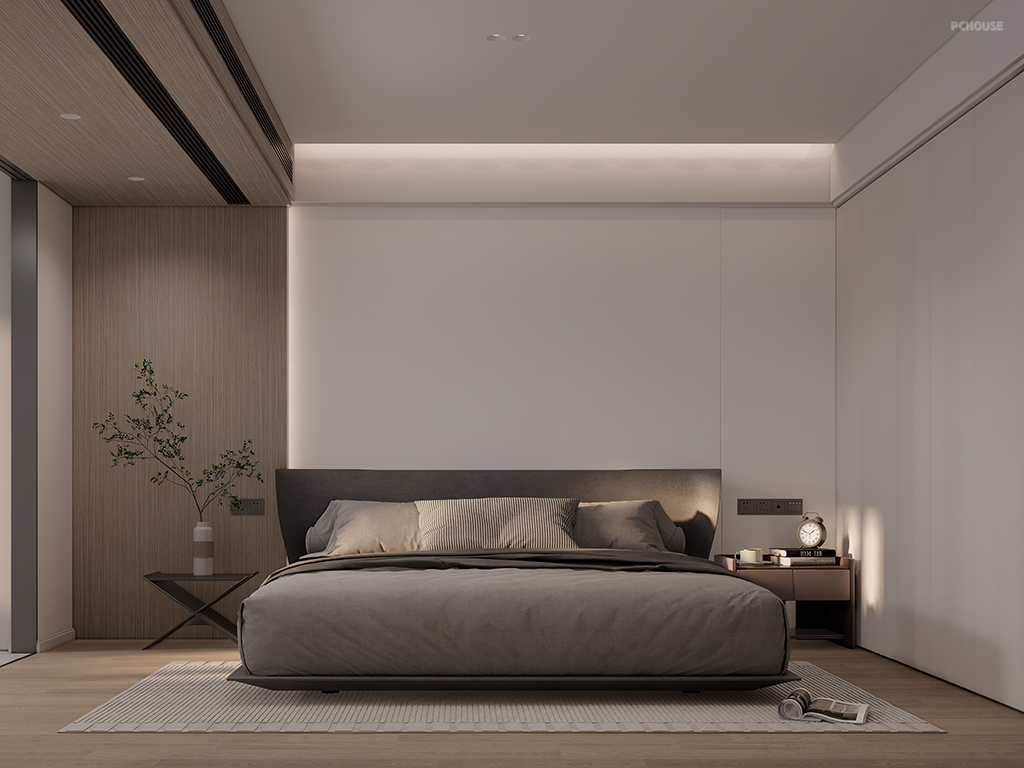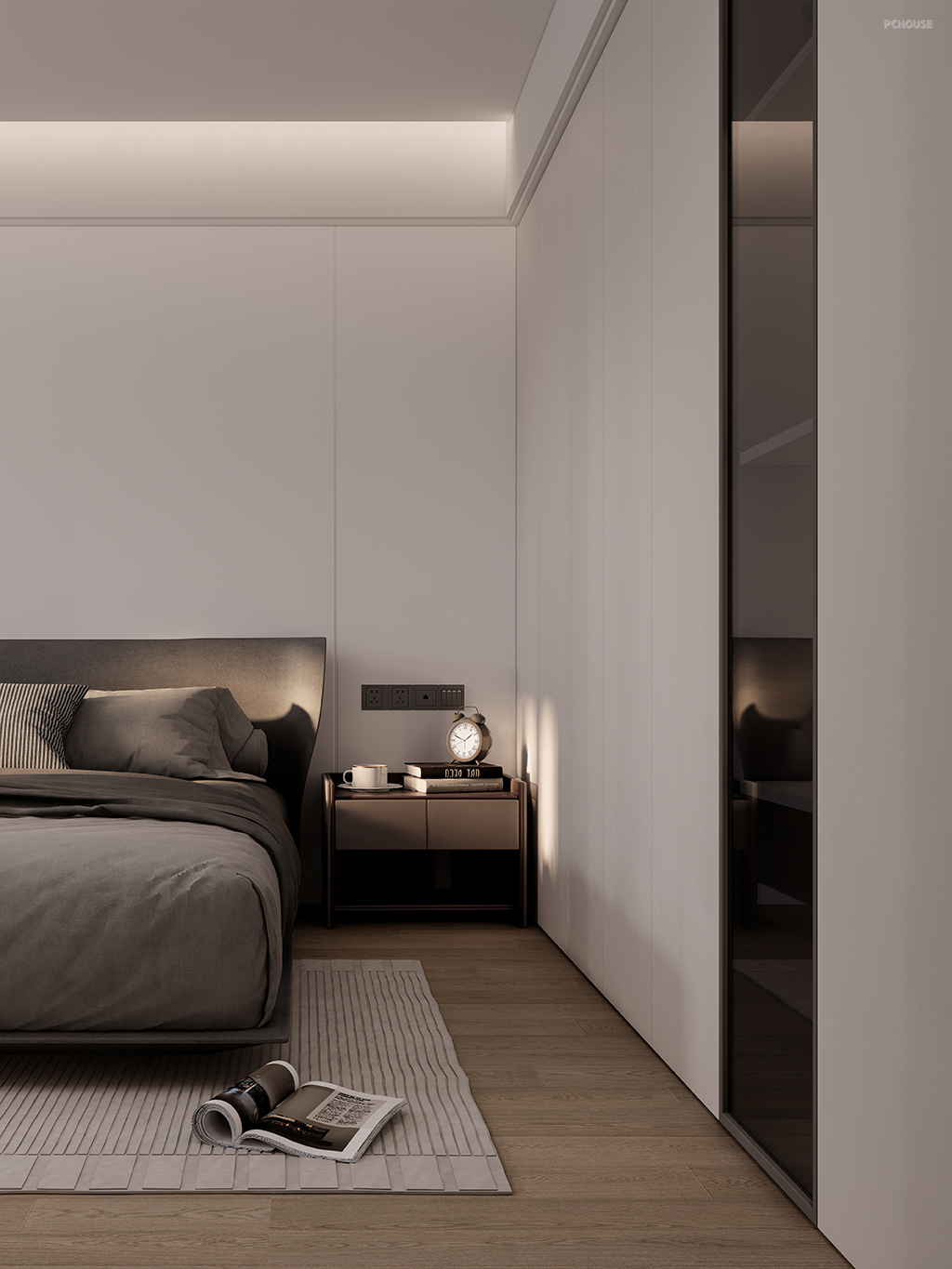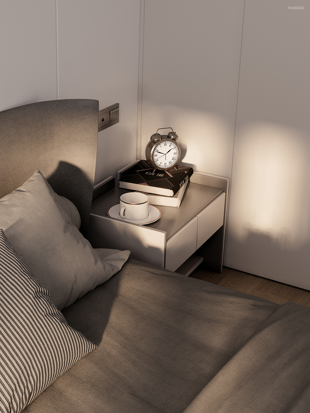 靠近床头的空间放上简约大气的床头柜,可以盛放深夜的几本读物,或是清晨的一杯咖啡。
